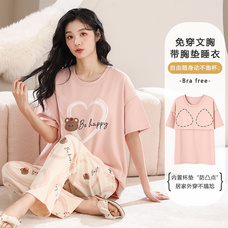 带胸垫一体睡衣女士夏季纯棉短袖长裤新款可外穿家居服套装