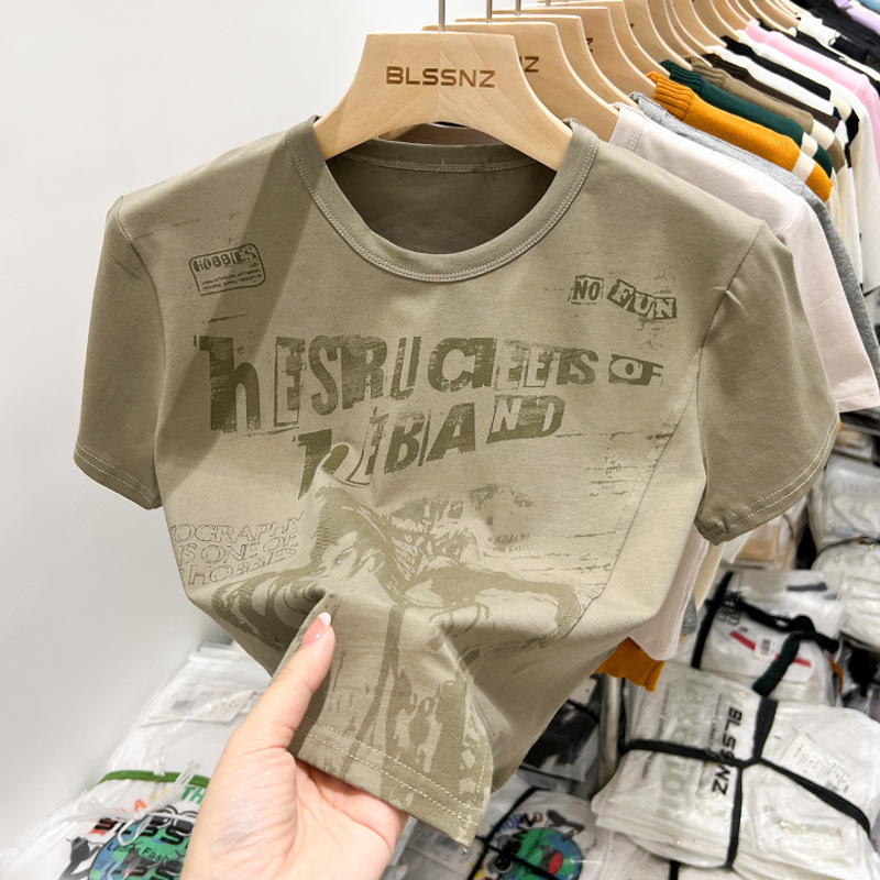 不规则正肩短袖t恤女ins潮夏季新款独特别致美式印花短款上衣
