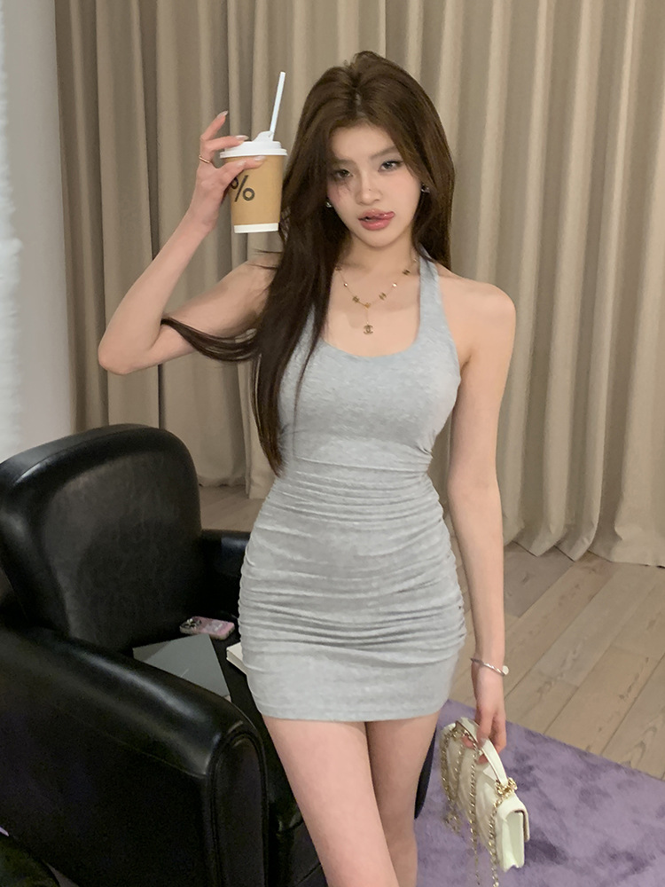 实拍 夏装辣妹掐腰纯欲风挂脖吊带连衣裙女收腰性感包臀短裙