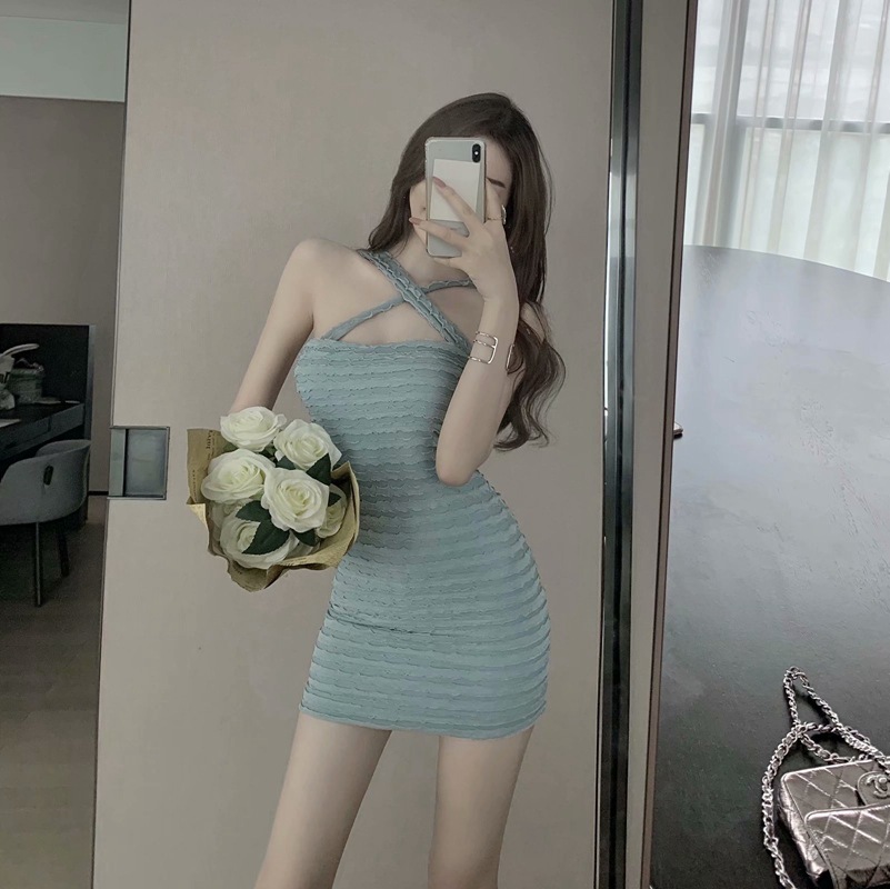 穿搭吊带裙高腰辣妹连衣裙纯欲风女装挂脖修身褶皱包臀裙度假