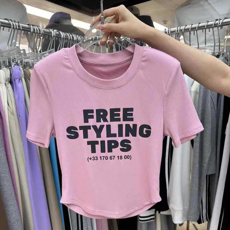 高档夏季韩版新款修身显瘦字母印花圆领短袖t恤女不规则百搭上衣