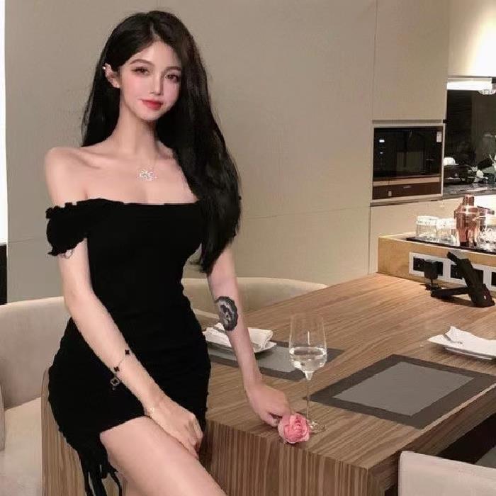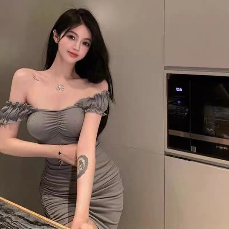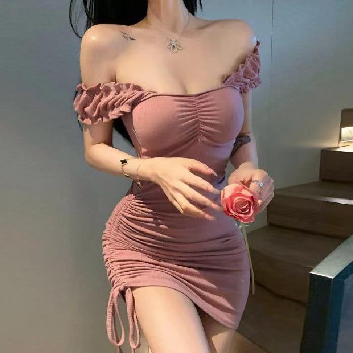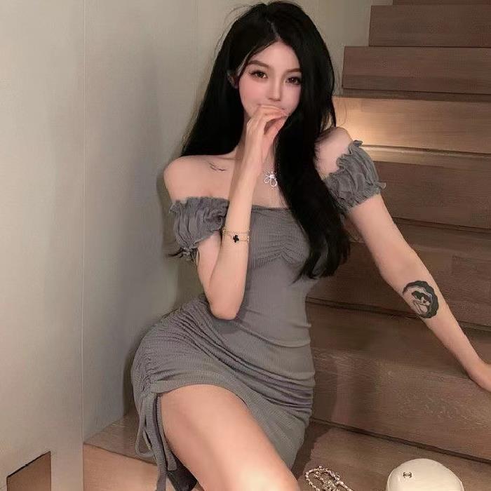 纯欲风一字肩包臀裙女夏新款辣妹甜美抽绳绑带小众收腰显瘦连衣裙