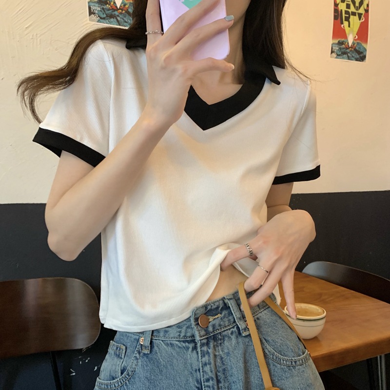polo衫v领短袖T恤女夏季新款设计感小众撞色高腰短款正肩纯棉上衣
