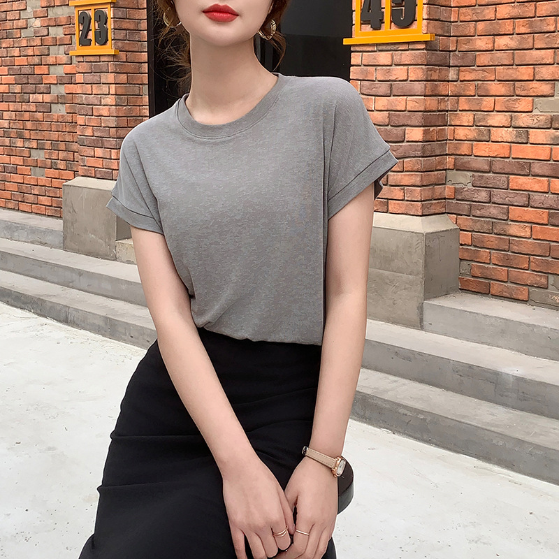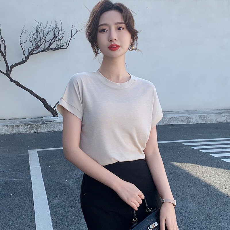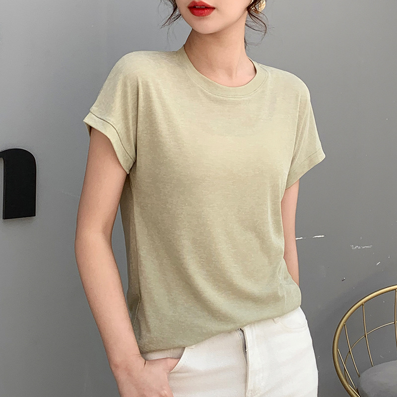 天丝小飞袖女短袖t恤春夏打底简约扎染圆领宽松显瘦纯色休闲上衣