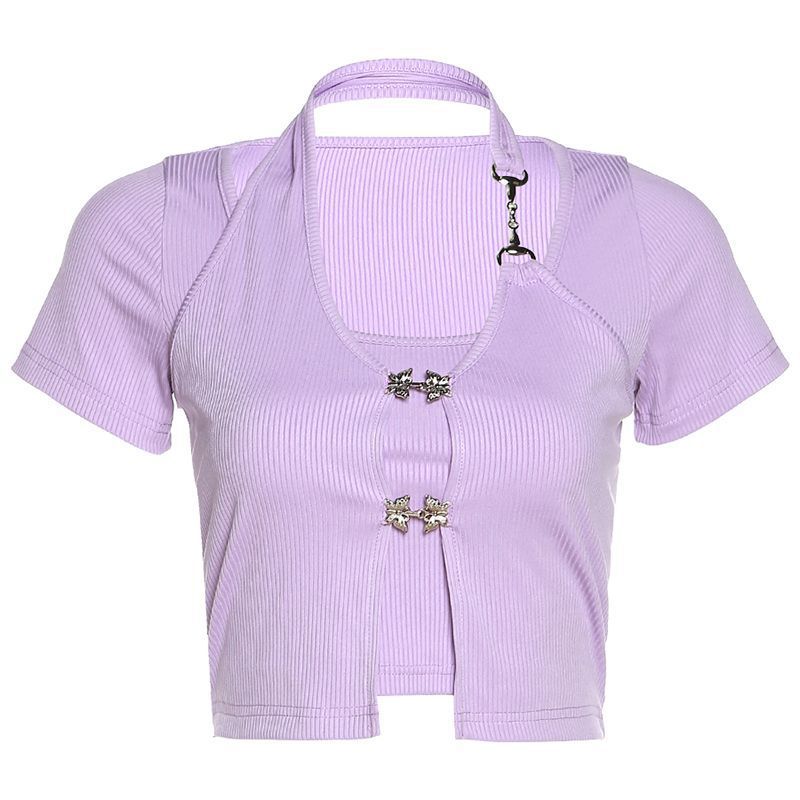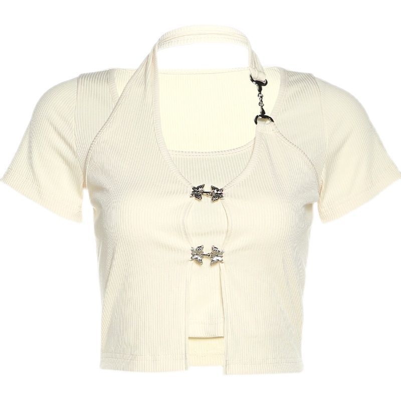 美式拼色正肩t恤女短袖春夏新款辣妹修身设计感假两件短上衣