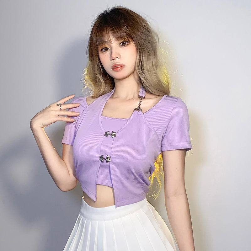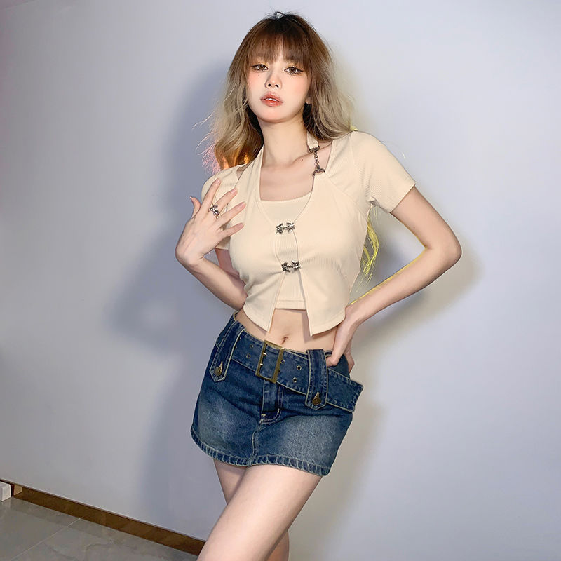 夏季新款辣妹风露脐显瘦短袖上衣美式拼接设计感假两件T恤女