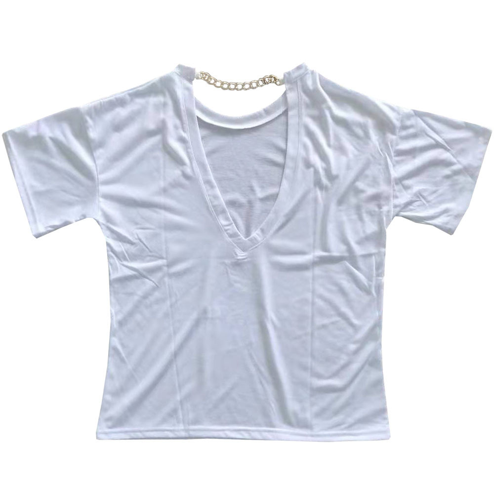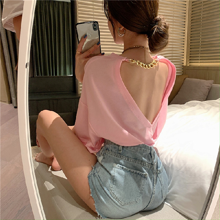 年新款春季女装洋气性感露背短袖宽松链条上衣中长款T恤潮