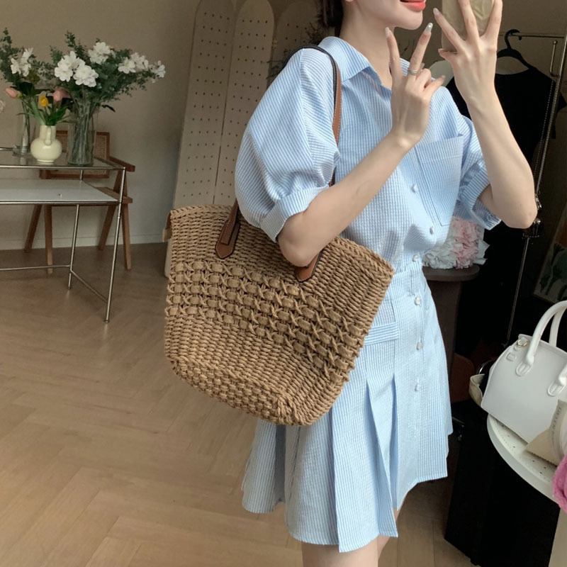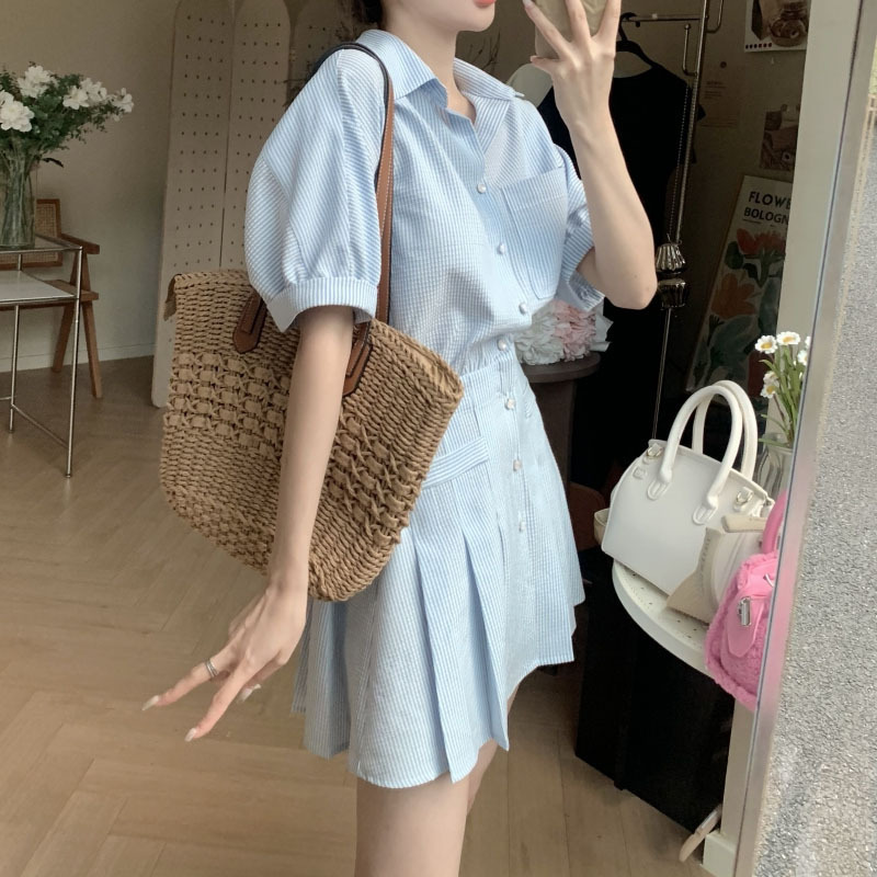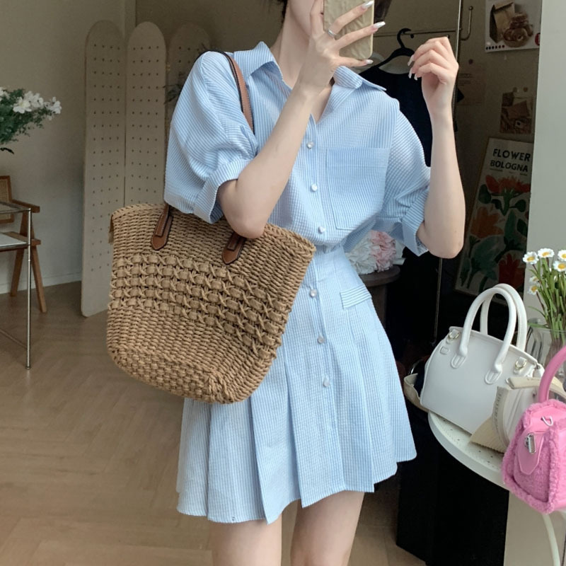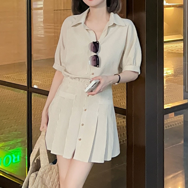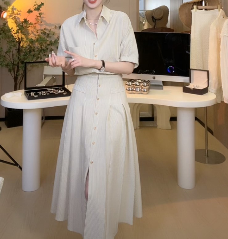减龄时尚Polo领条纹衬衫连衣裙女显瘦高级感半袖茶歇法式百褶裙夏