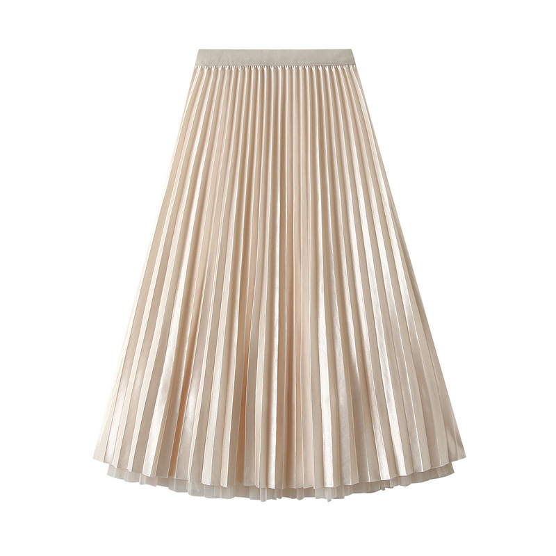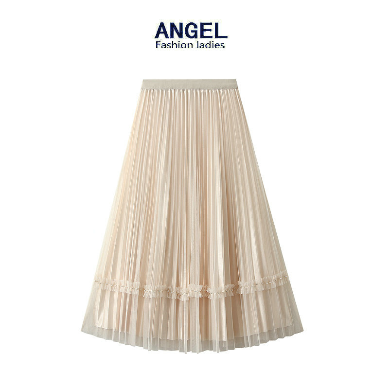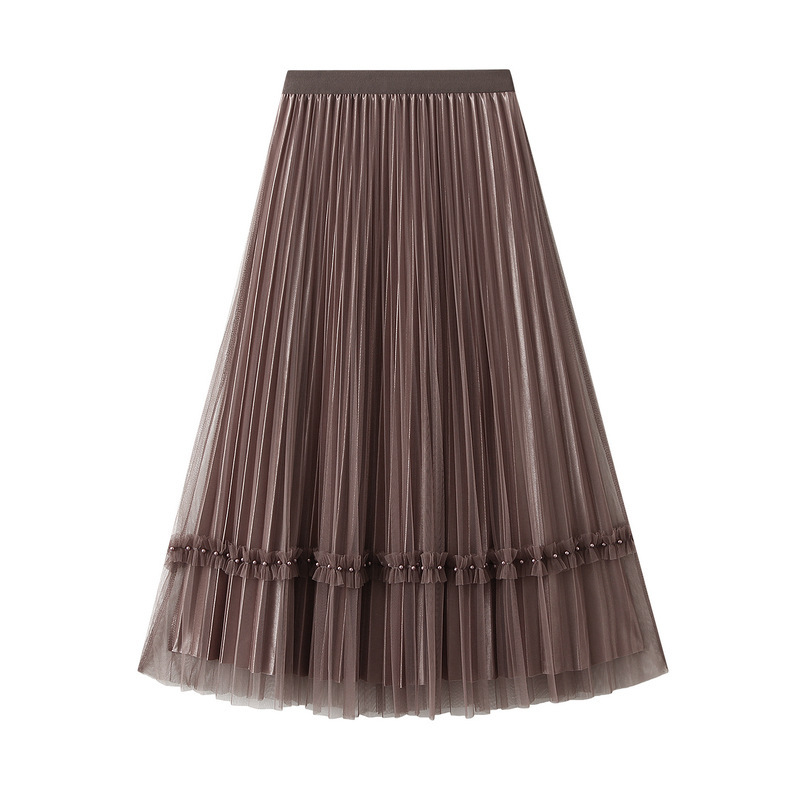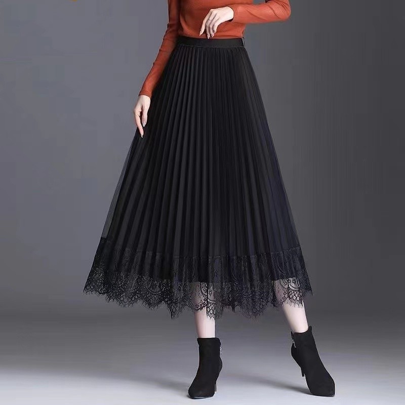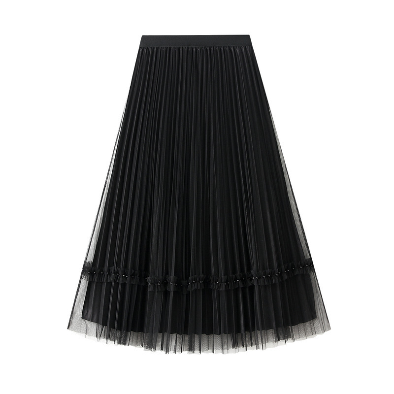 夏季百褶裙高级感韩版大摆网纱裙纯色长裙a字女垂感花边半身裙女