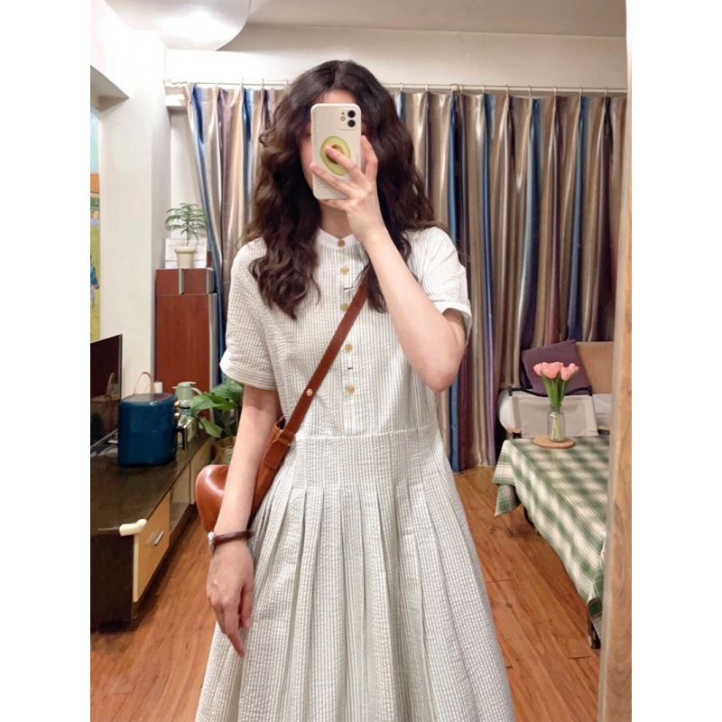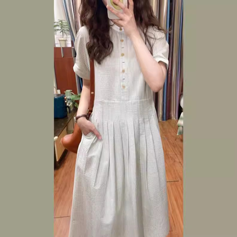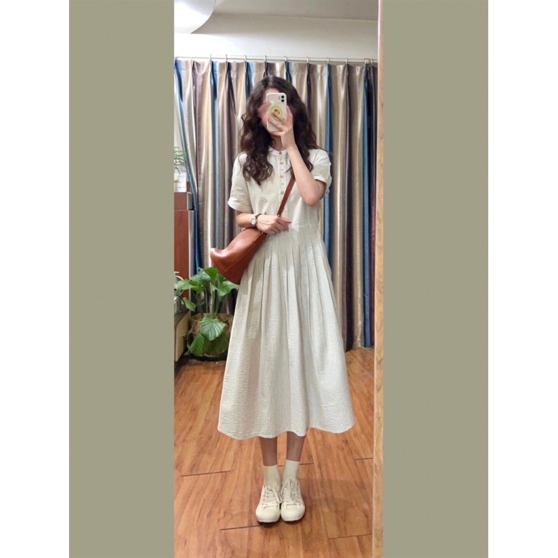 法式茶歇泡泡条纹短袖连衣裙女高级感文艺气息温柔收腰百褶中长款