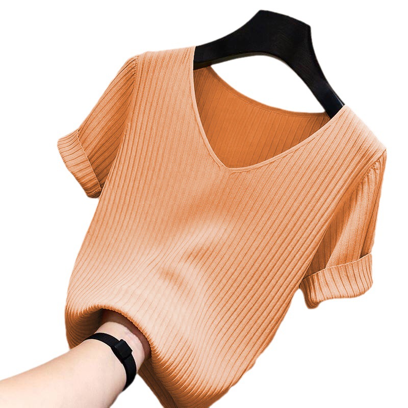 新款冰丝针织衫宽松V领打底黑色T恤短袖女纯色ins潮春秋季薄