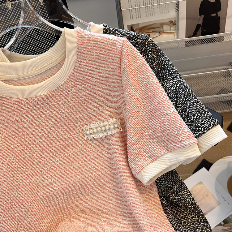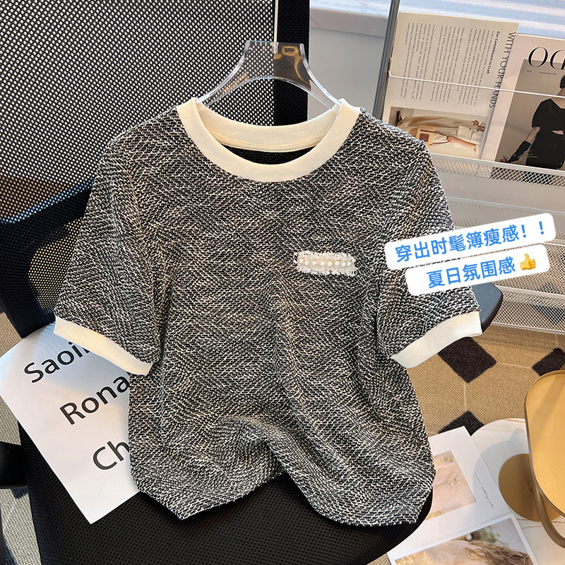 法式小香风短袖t恤女装夏季新款设计感小众冰丝针织粉色上衣