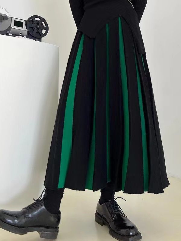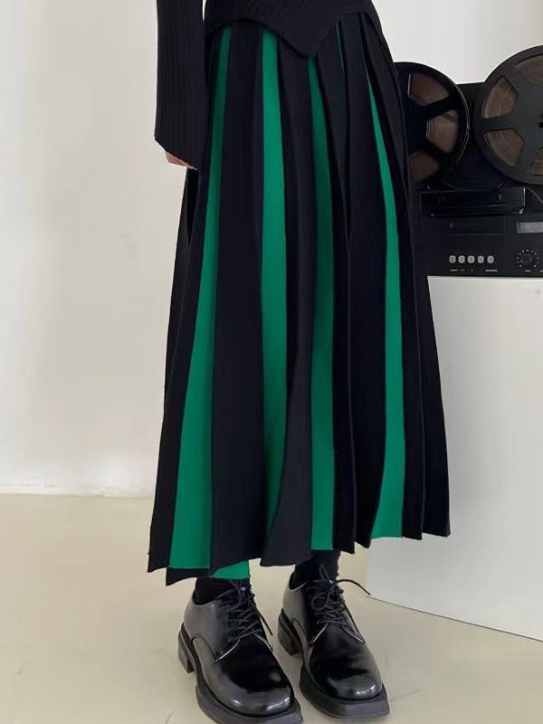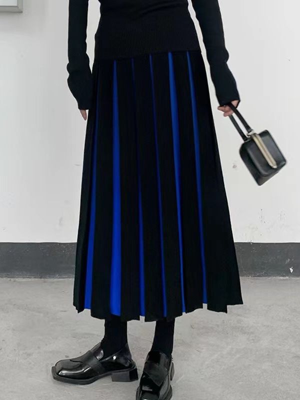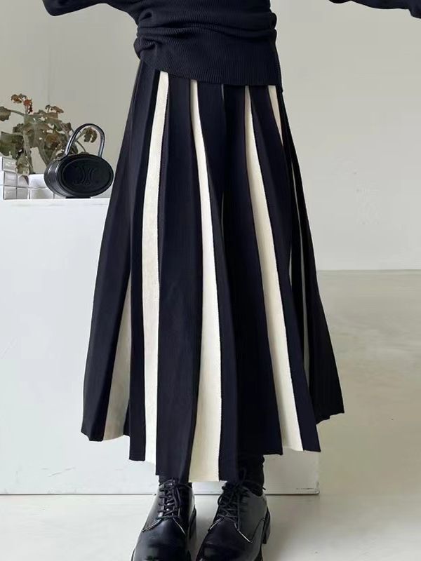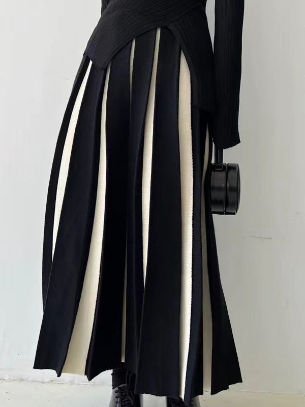 欧货秋冬针织裙女秋季高级感高腰拼色中长款百褶裙半身长裙潮