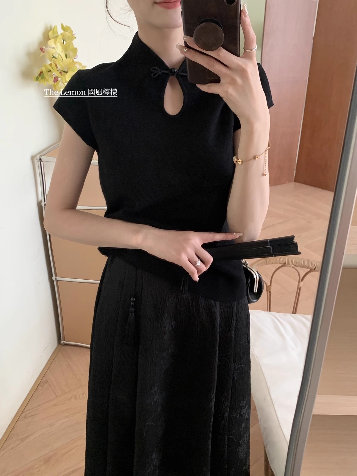 春夏新款时尚复古气质国风盘扣半高领短袖上衣修身显瘦百搭女