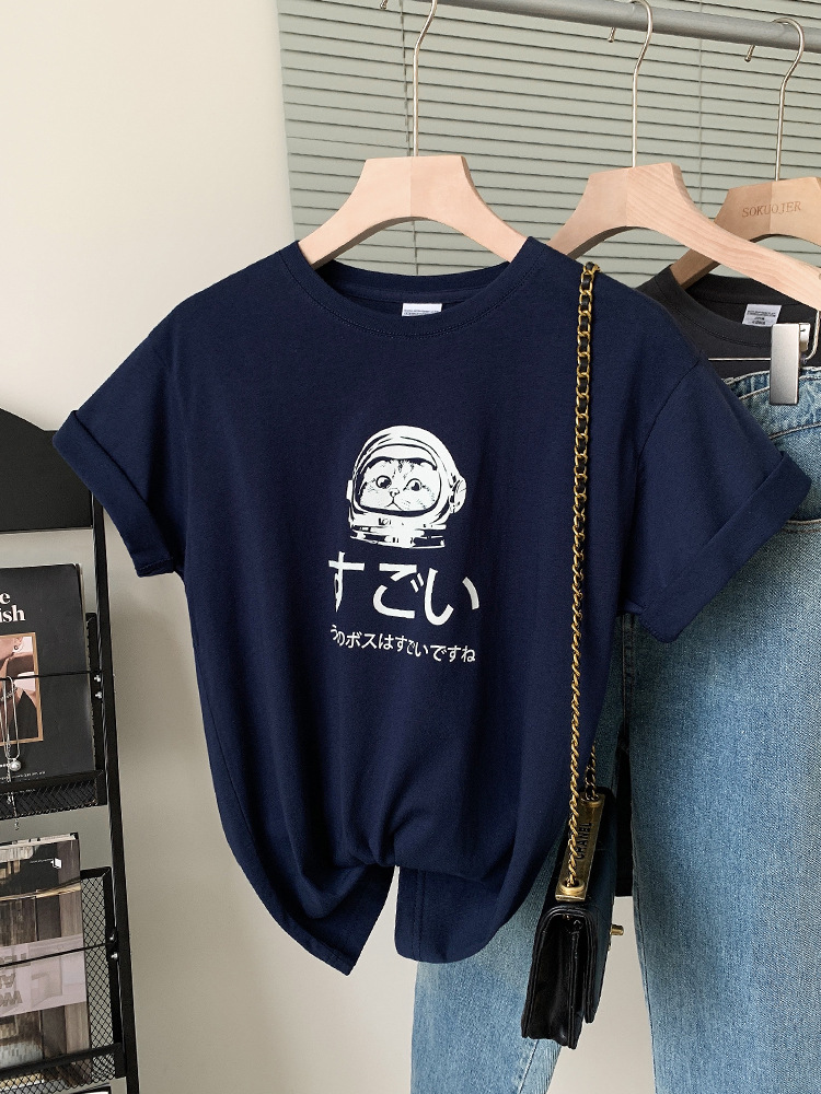 正肩纯棉短袖t恤女夏季薄款圆领内搭宽松白色上衣太空猫-YAS003