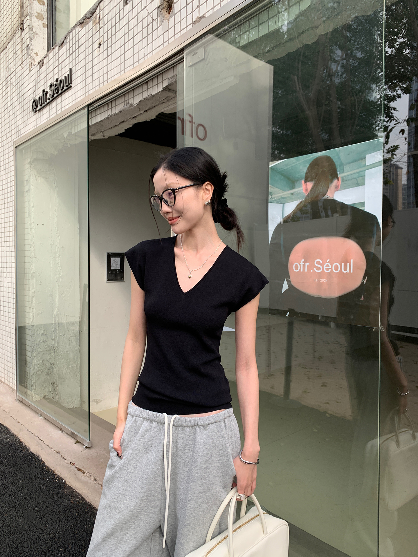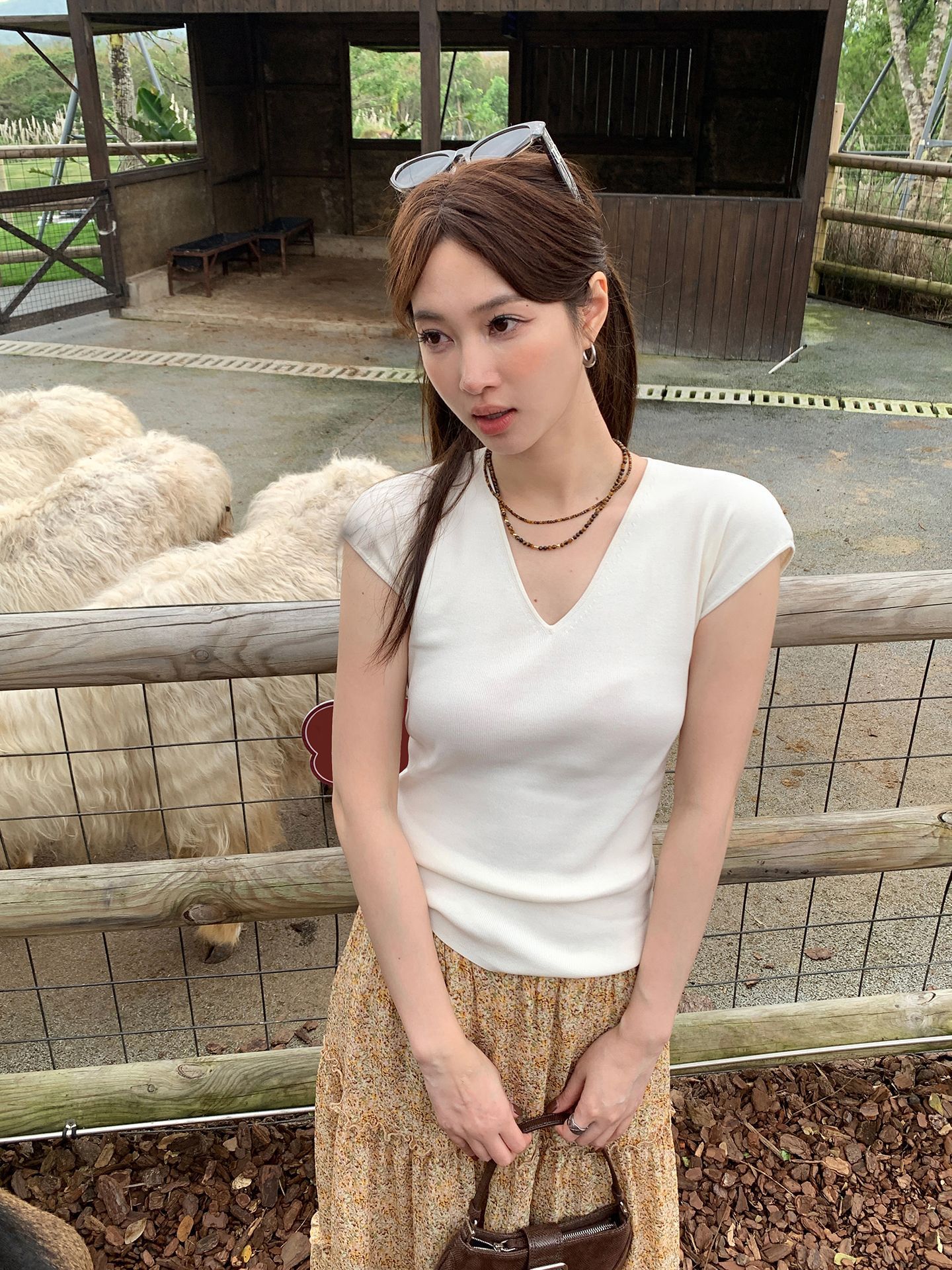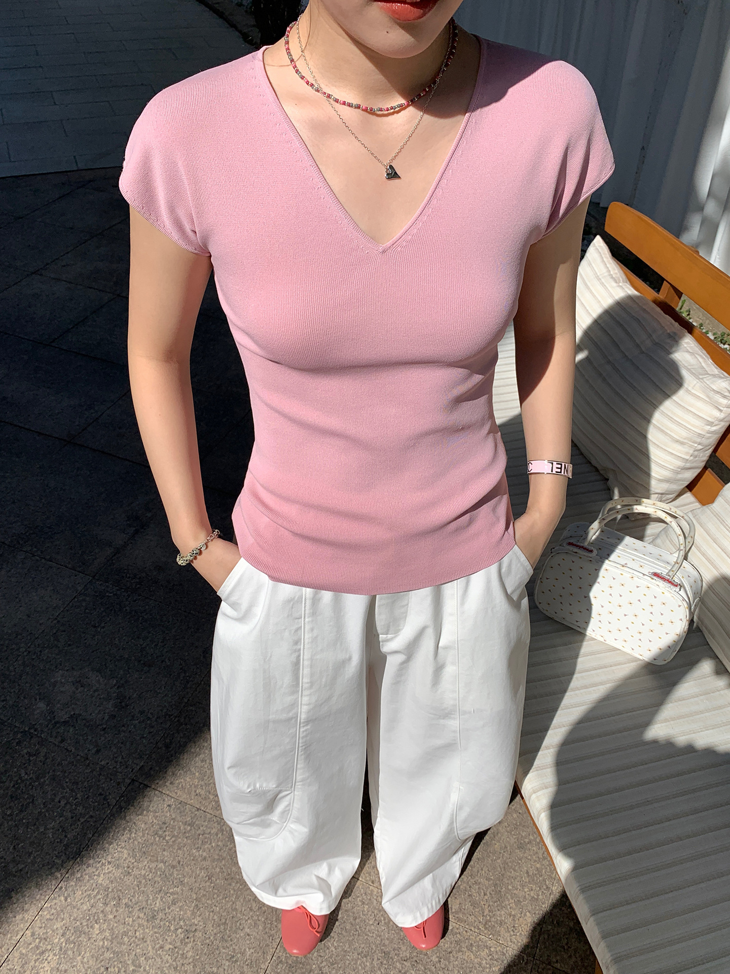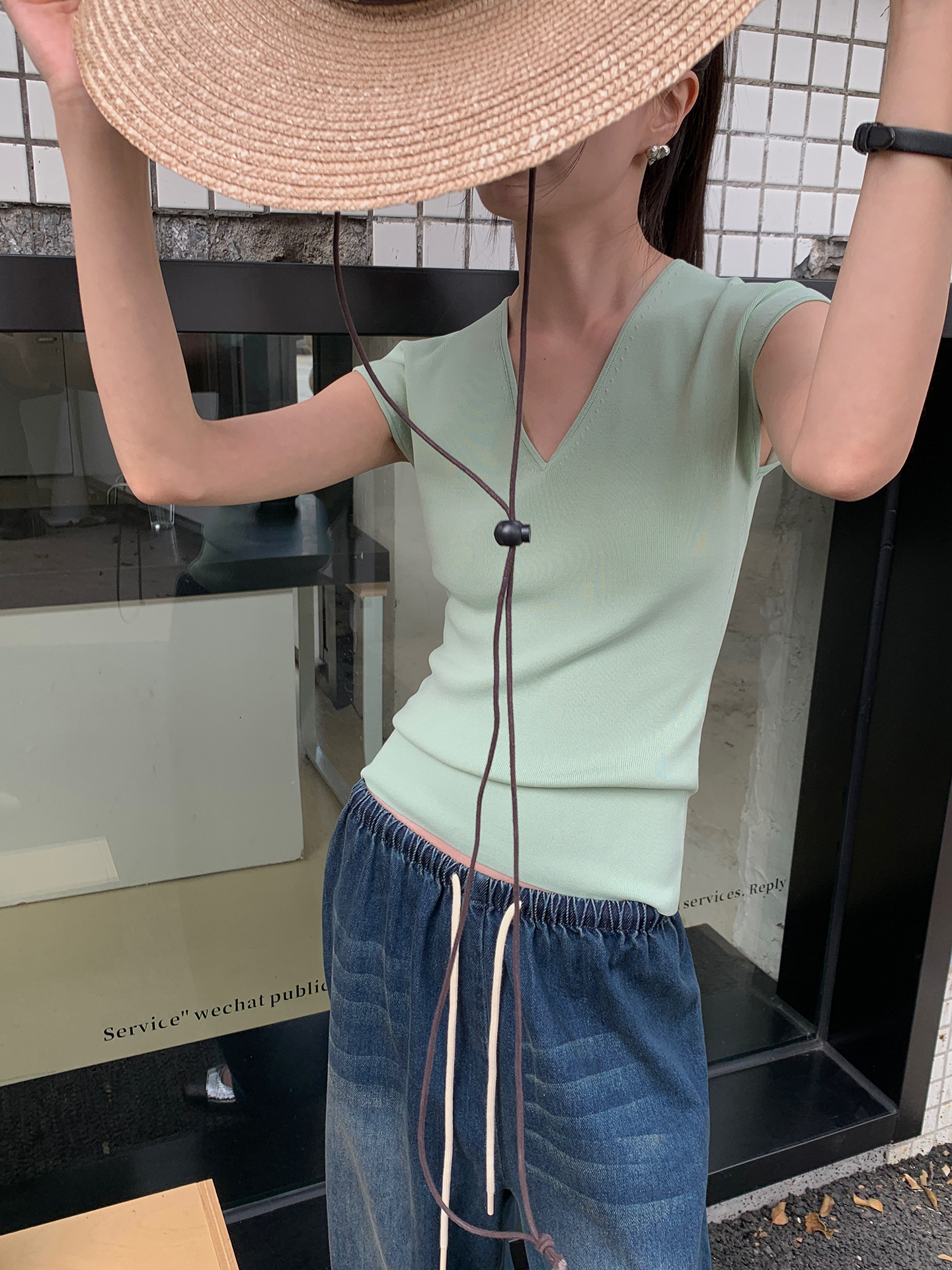 趋梦DT ETOLIE显瘦气质V领正肩T恤短袖女修身新款针织上衣女春季