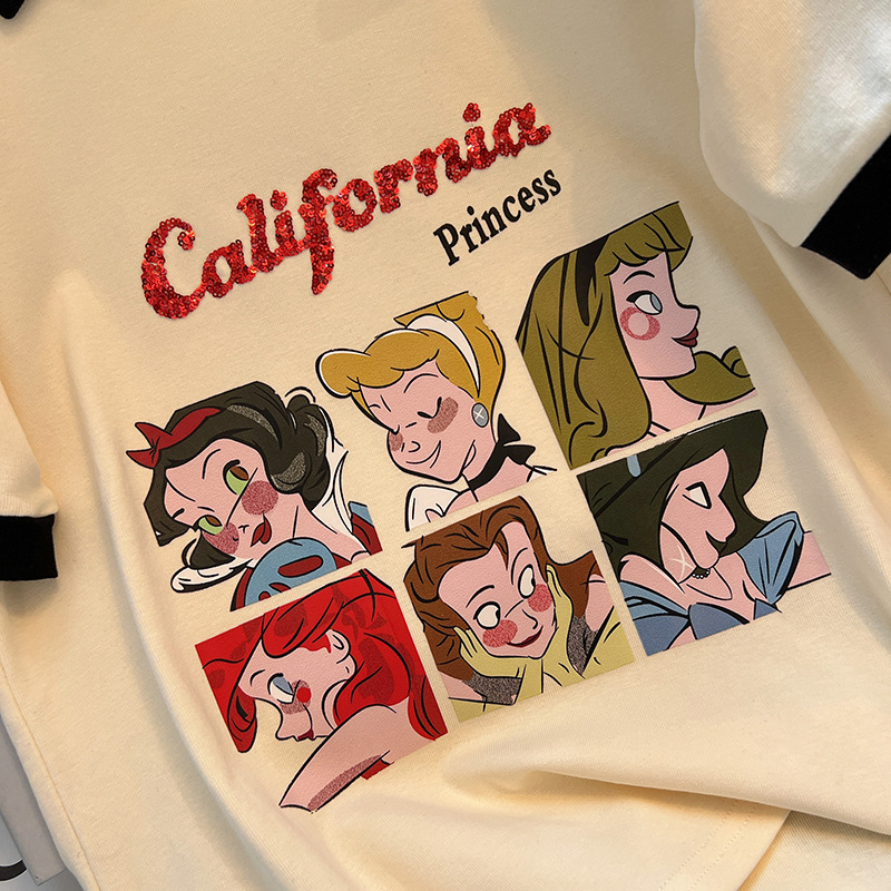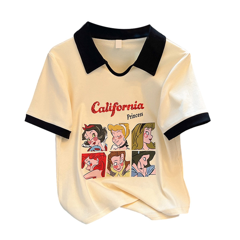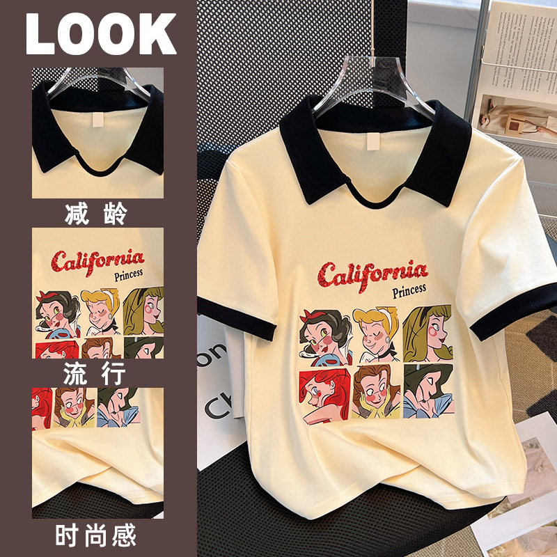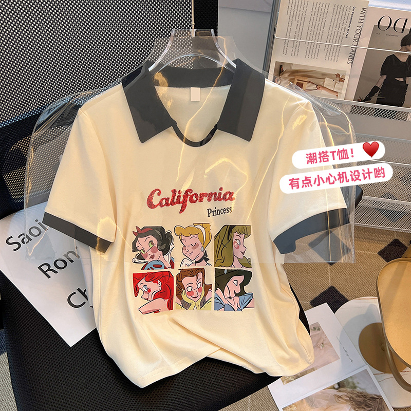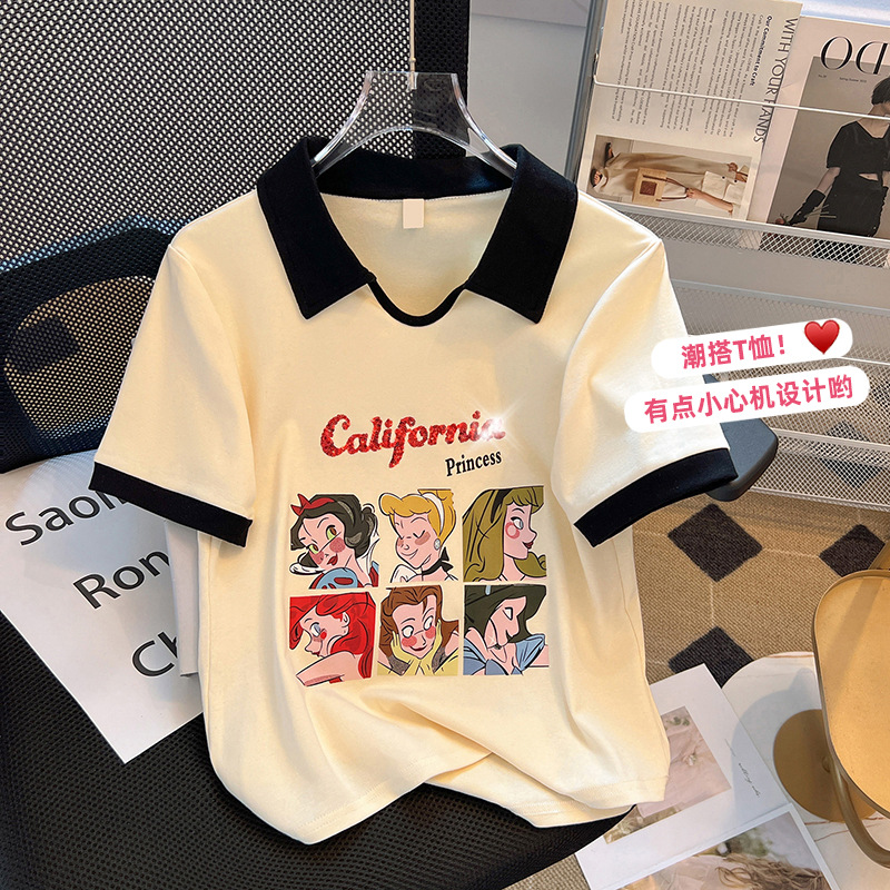 撞色正肩短袖t恤女夏季新款亮片印花polo领修身减龄短款上衣