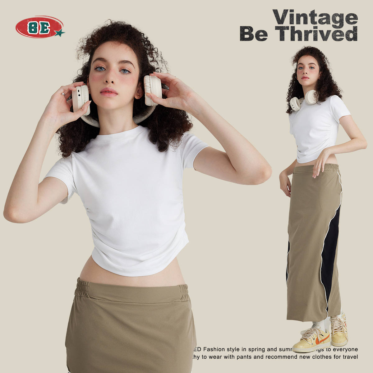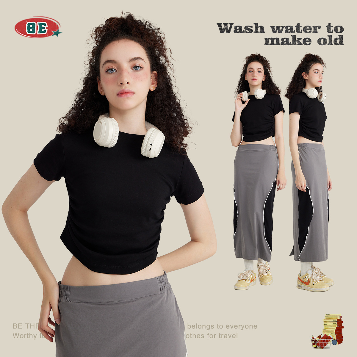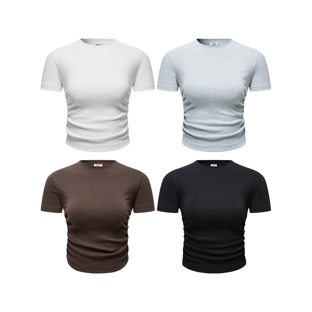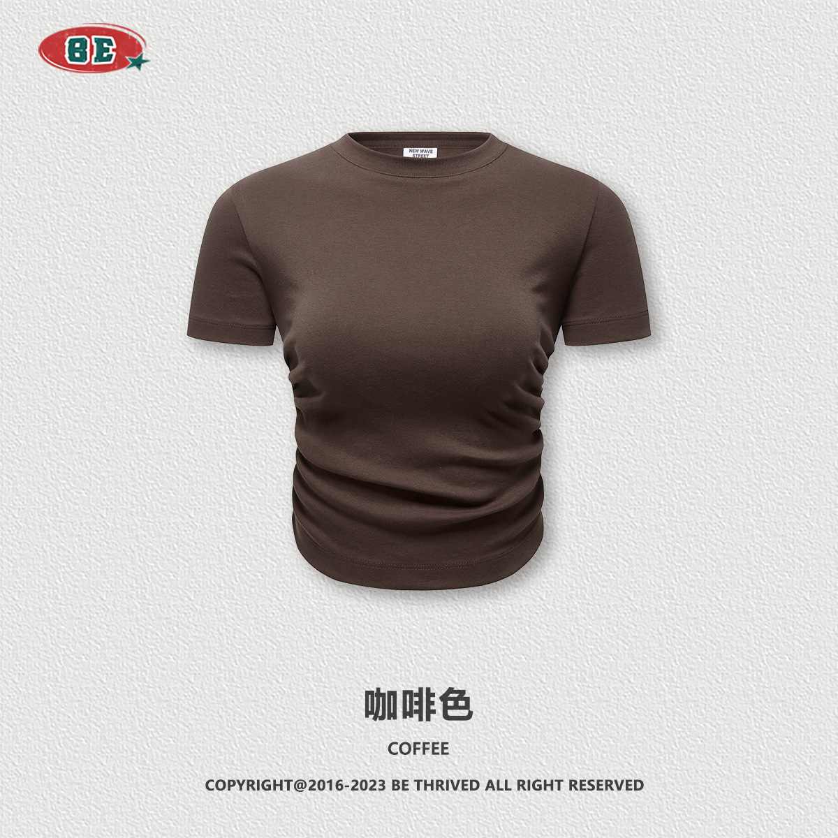 小众设计感侧边褶皱收腰短袖欧美ins潮牌T恤女夏季