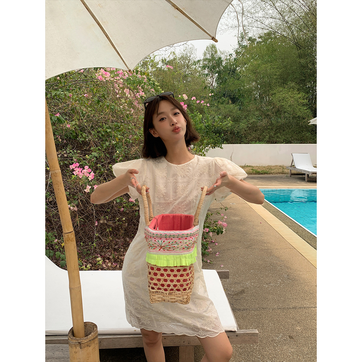 诠释美NEW OPEN连衣裙女夏优雅泡泡袖镂空圆领气质绣花82505