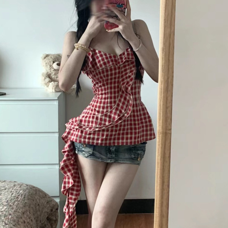 夏秋季新款红格甜辣妹不规则荷叶边飘带吊带修身显瘦无袖上衣女