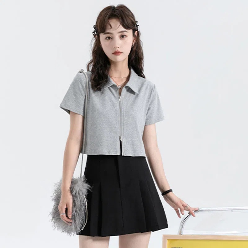 polo翻领双拉链短袖t恤女短款夏季新款韩版设计感小众ins上衣