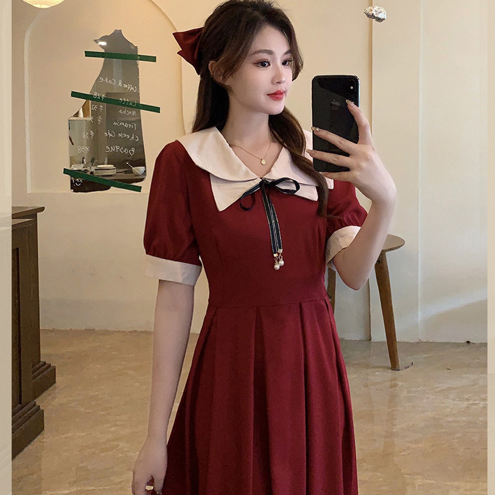 新款夏季洋气学院风法式减龄收腰显瘦娃娃领连衣裙潮