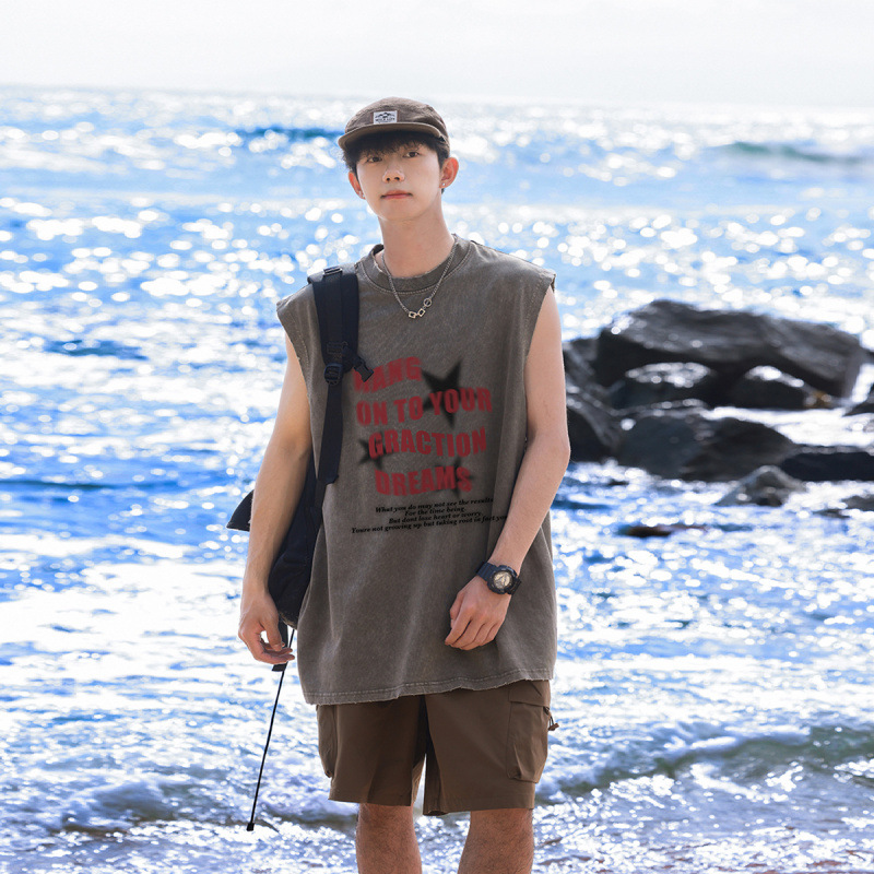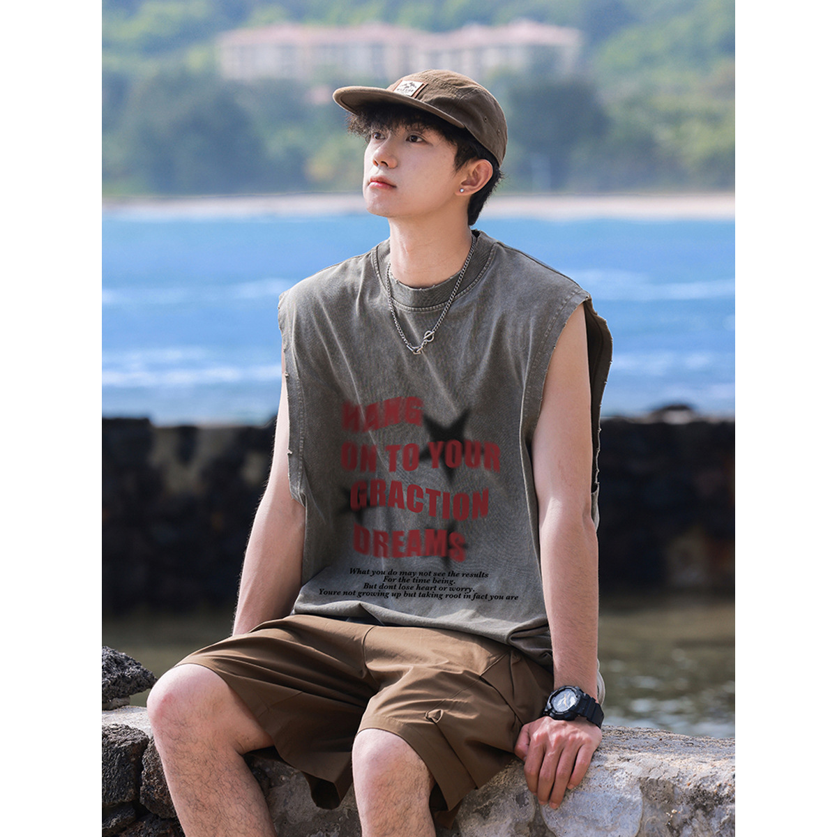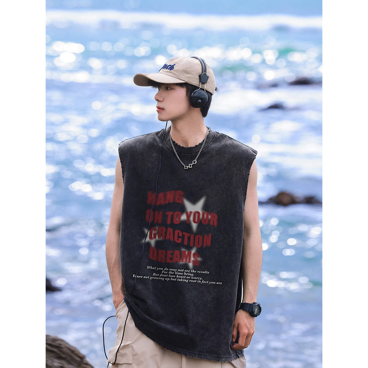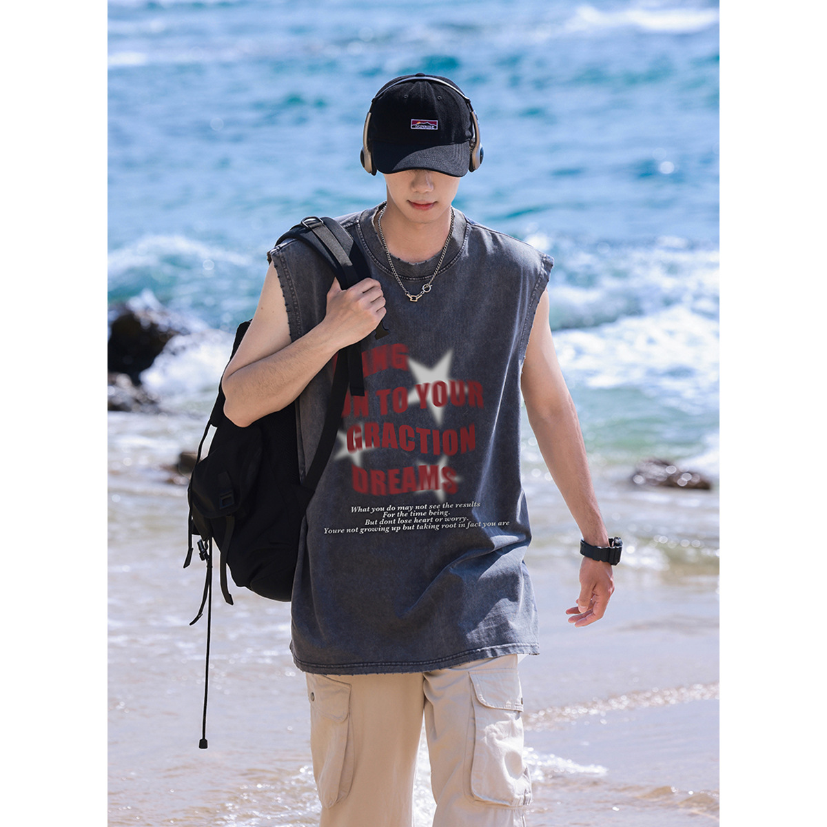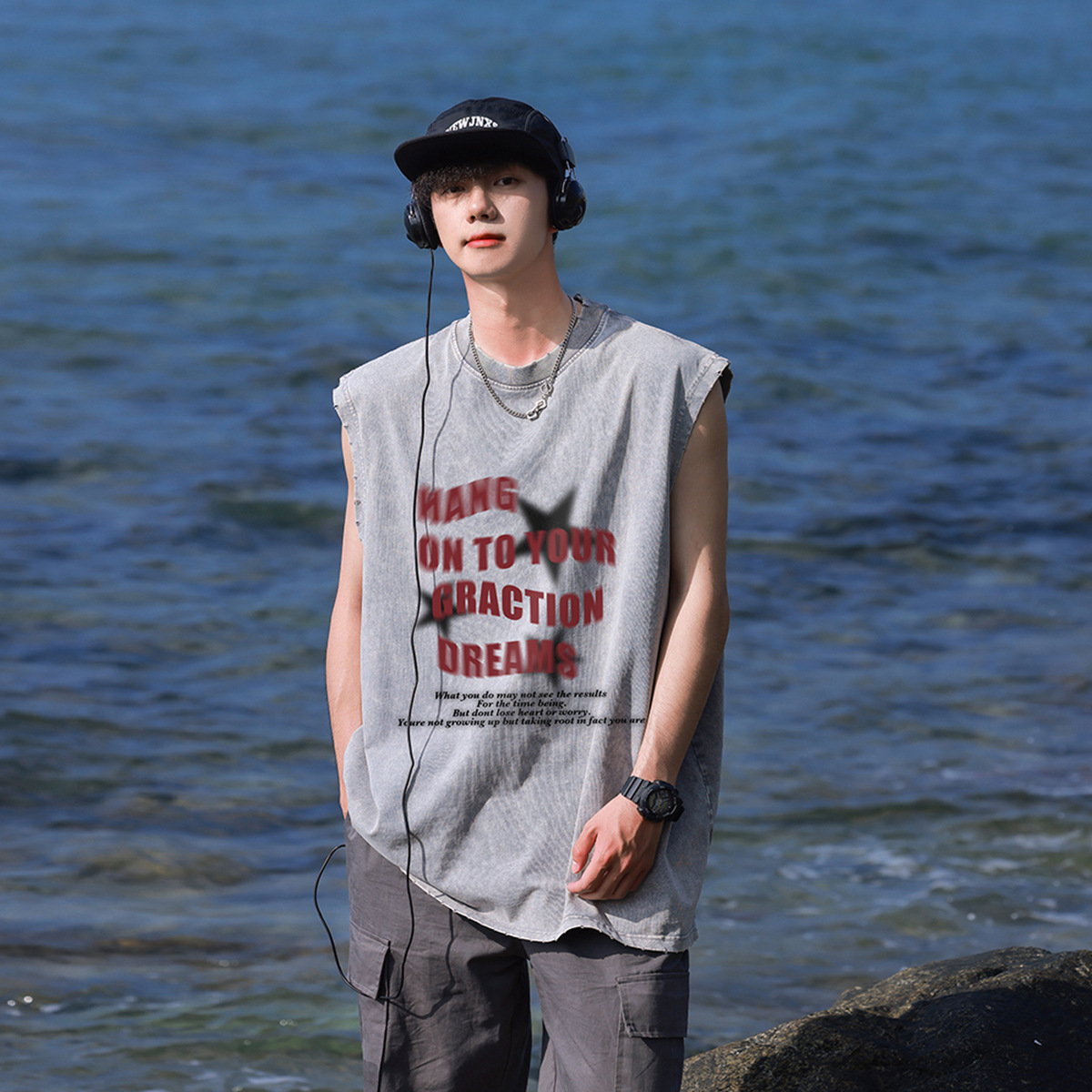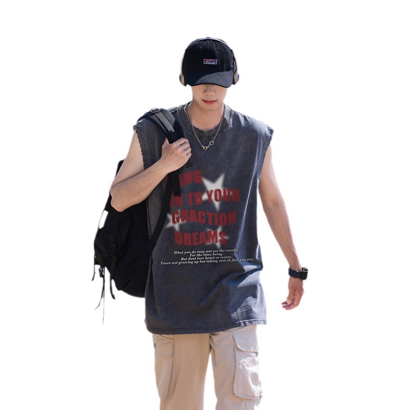 男士夏季无袖T恤潮牌美式水洗棉宽松篮球背心圆领青年个性休闲t恤