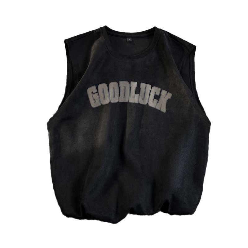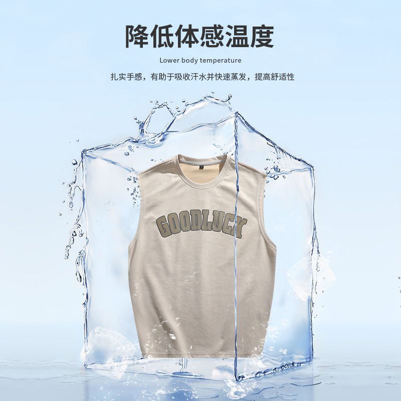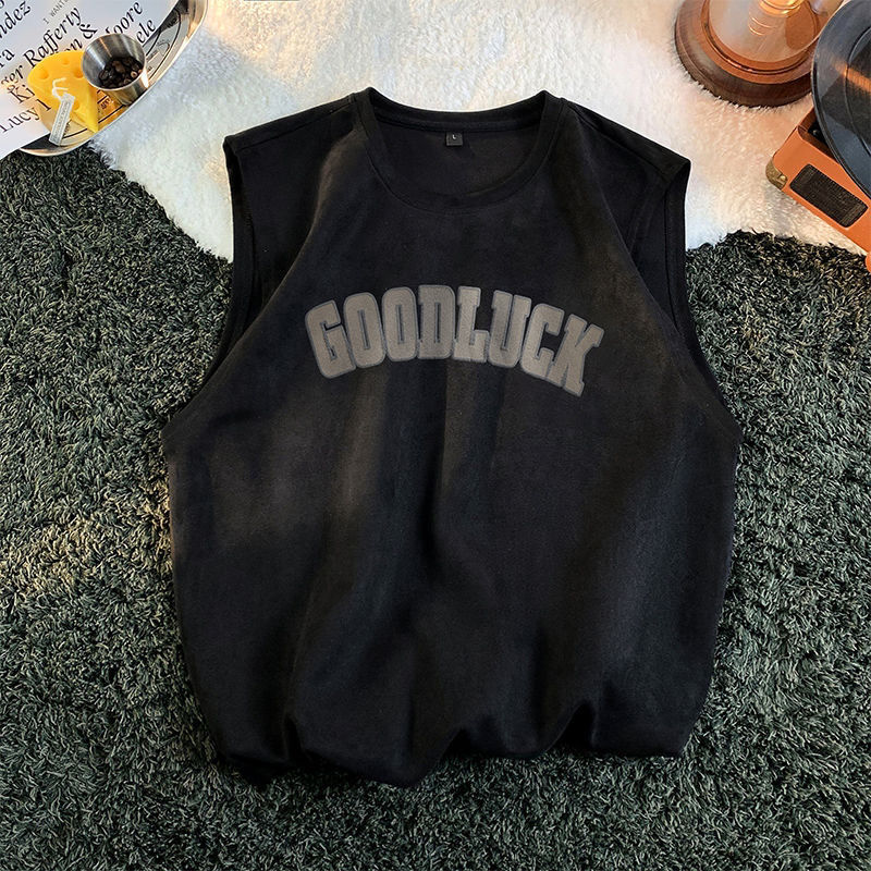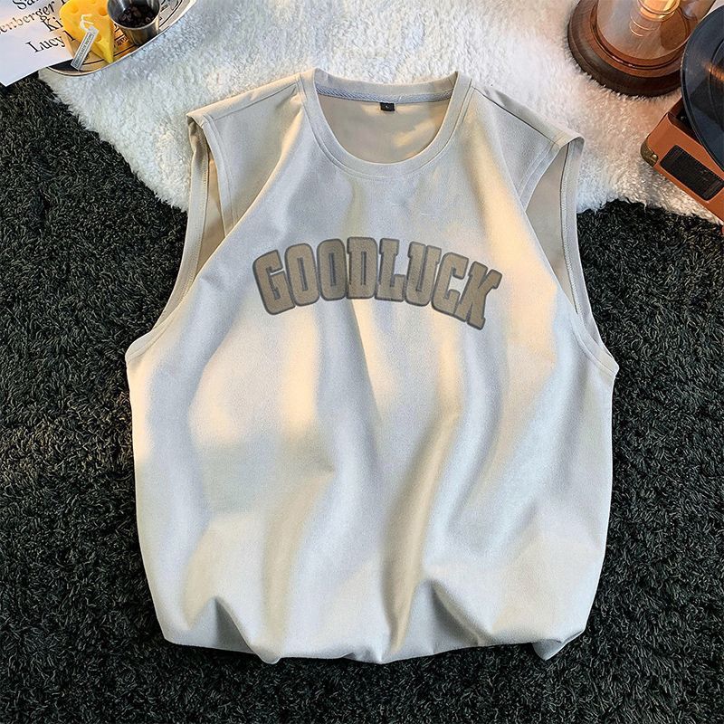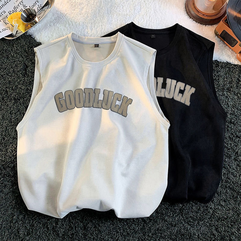 麂皮绒背心男士夏季美式潮牌无袖t恤男款宽松运动坎肩重磅短袖男