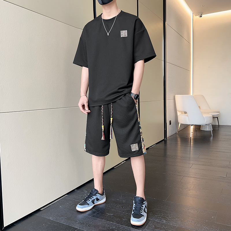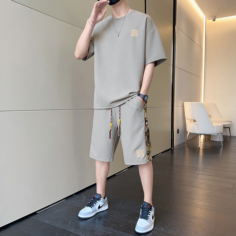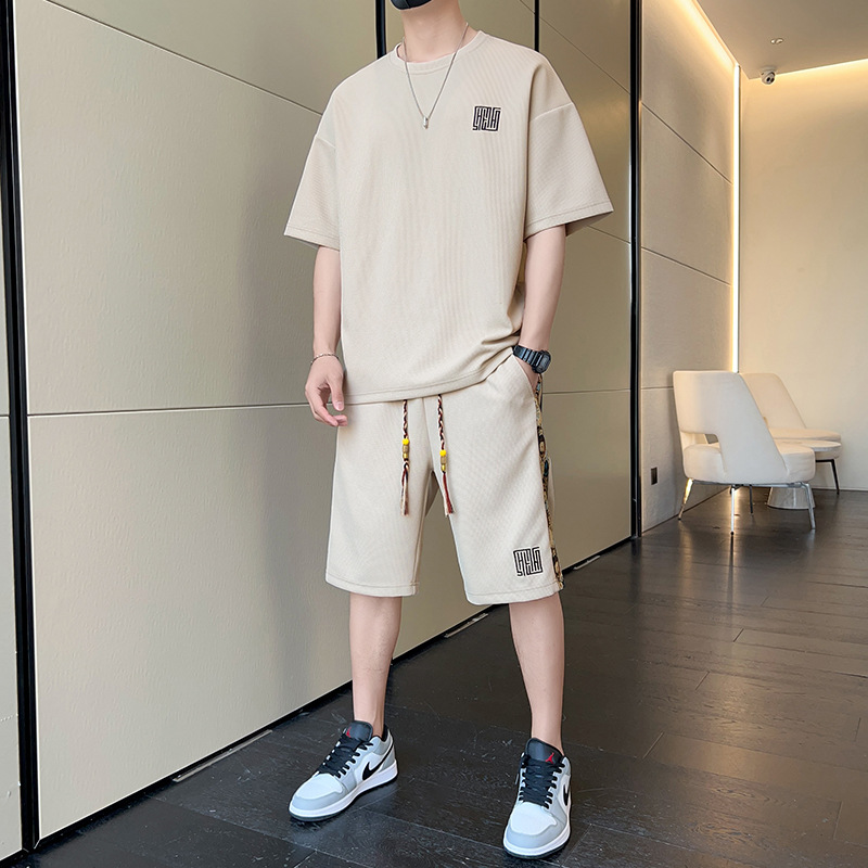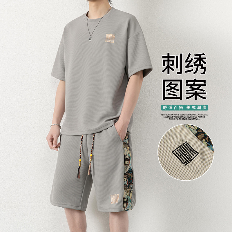 新款男式套装两件套华夫格夏季大码运动休闲短袖T恤上衣短裤t恤