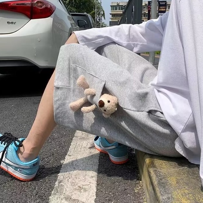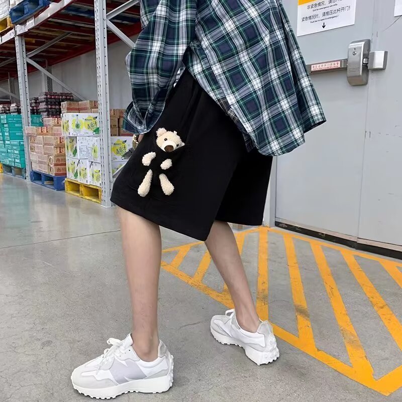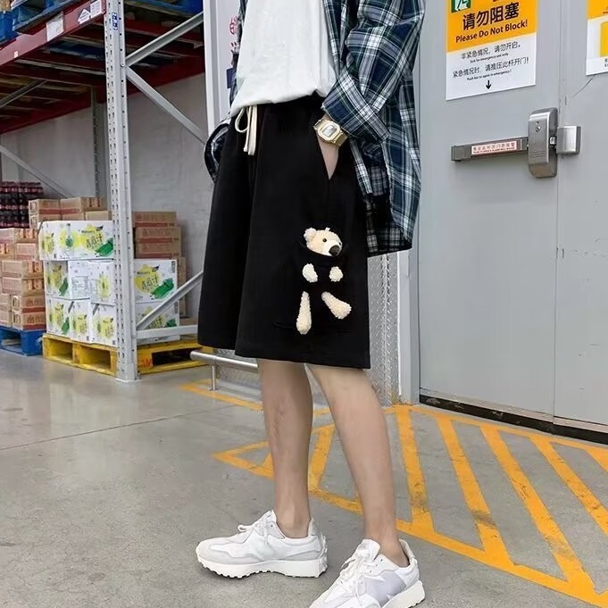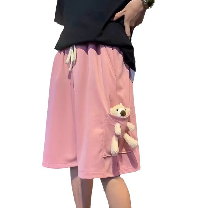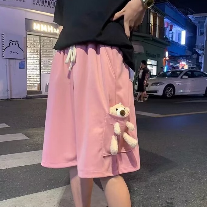 多巴胺粉色小熊玩偶短裤男生高街痞帅休闲五分裤宽松直筒夏季中裤