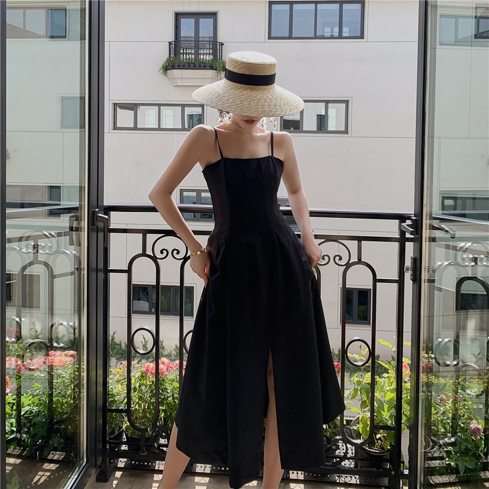 夏新款法式赫本风小黑裙设计感小众黑色吊带连衣裙女海边度假
