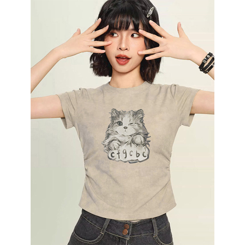 纯棉小猫正肩短款短袖t恤女夏季新款爆款小个子修身上衣夏装