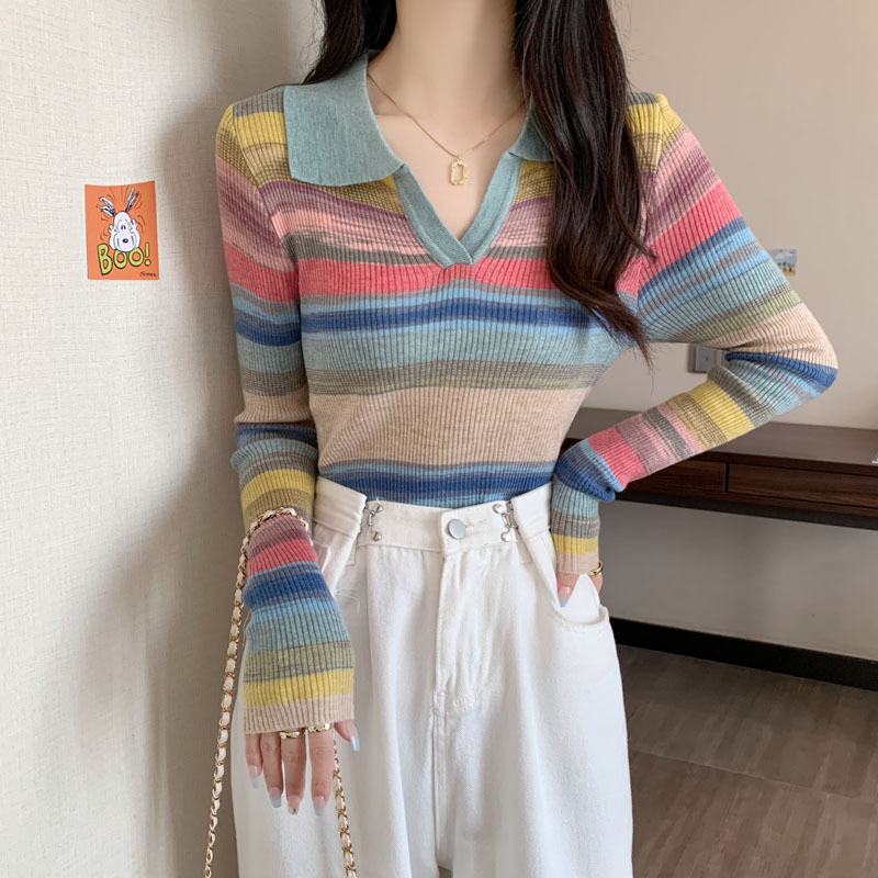 polo领条纹针织衫女早秋季新款撞色修身打底衫女内搭秋冬
