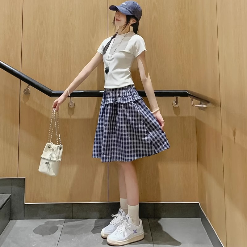 藏青色格子半身裙女夏季新款小个子高腰显瘦韩系两穿抹胸背心半裙