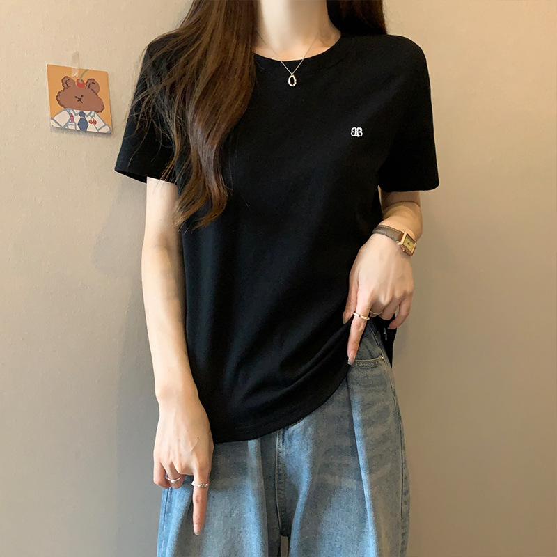 纯棉白色t恤女独特正肩小衫夏装新款设计感圆领短袖上衣刺绣