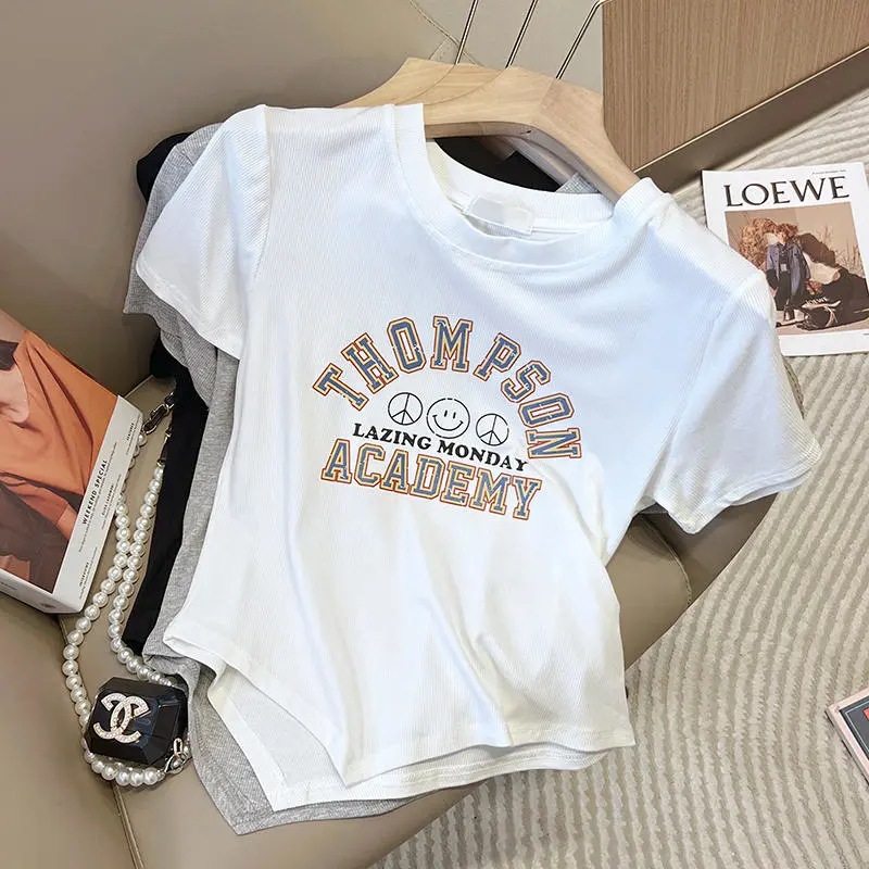 韩版圆领字母印花小众设计感不规则短袖T恤女夏新款别致上衣