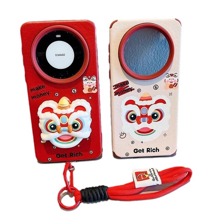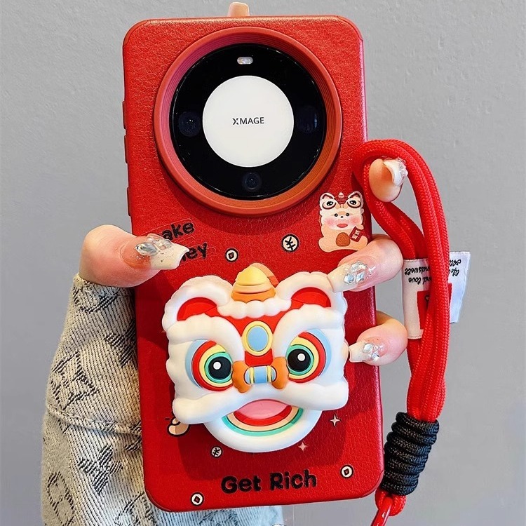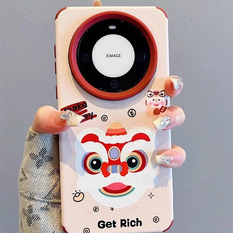 适用华为mate60pro手机壳p60立体醒舞狮支架50E皮质全包保护套40e