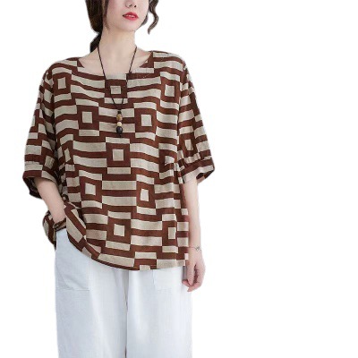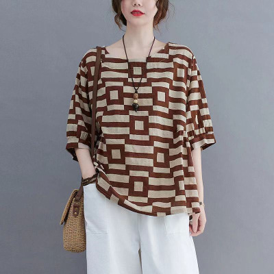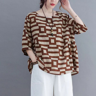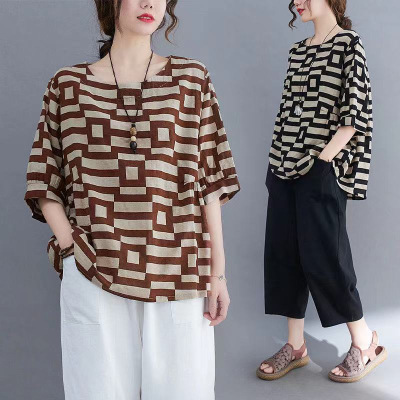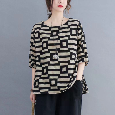 短袖t恤夏季韩版大码女装妈妈装圆领格子上衣显瘦遮肚打底衫