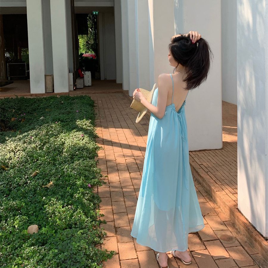 挂脖连衣裙露背女夏季新款高级感宽松吊带无袖飘逸沙滩长裙女