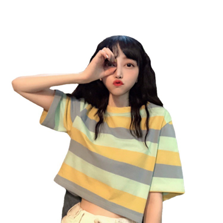 夏季新款宽松彩虹条纹短袖T恤女学生短款露脐上衣