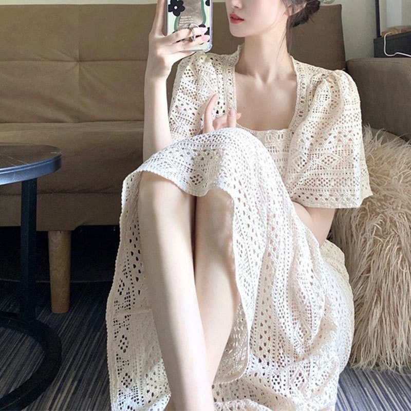 夏季新款法式温柔风小众设计长裙气质显瘦方领蕾丝连衣裙子女