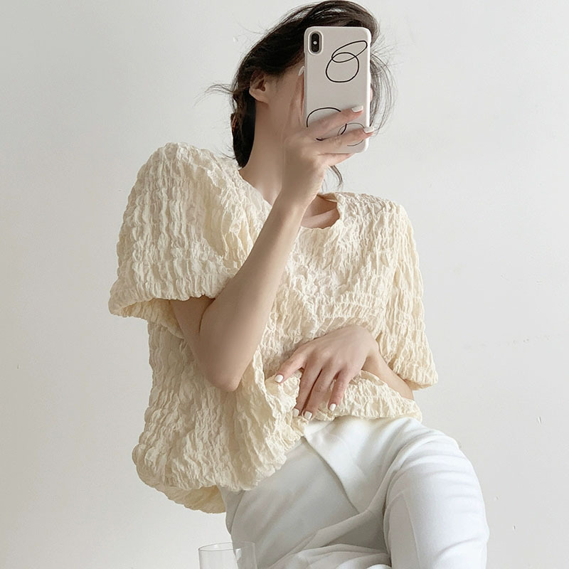 夏装新款法式泡泡褶皱t恤女宽松气质体恤上衣圆领短袖衣服女