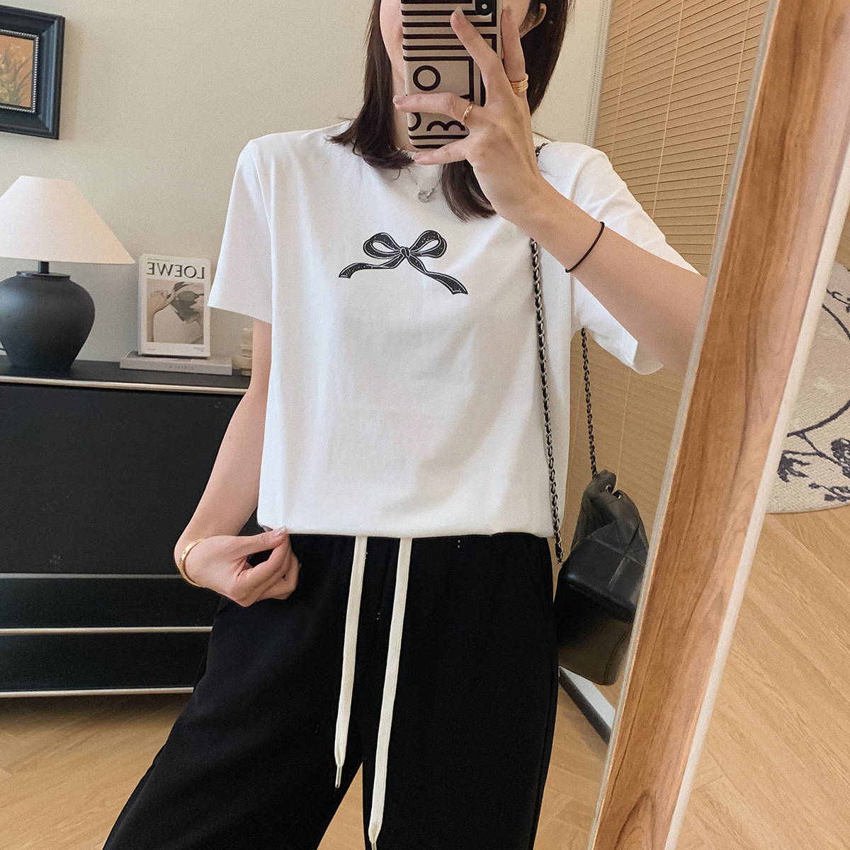 韩系减龄手绘蝴蝶结印花宽松短袖!#