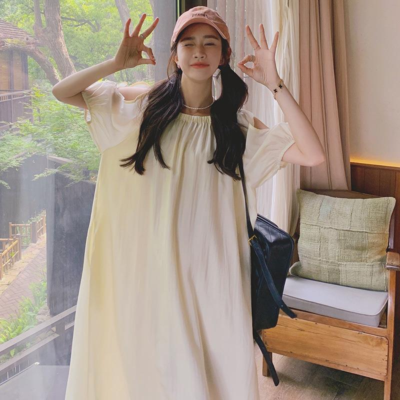 实拍圆领露肩设计韩版系带收腰显瘦宽松慵懒风长款减龄杏色连衣裙