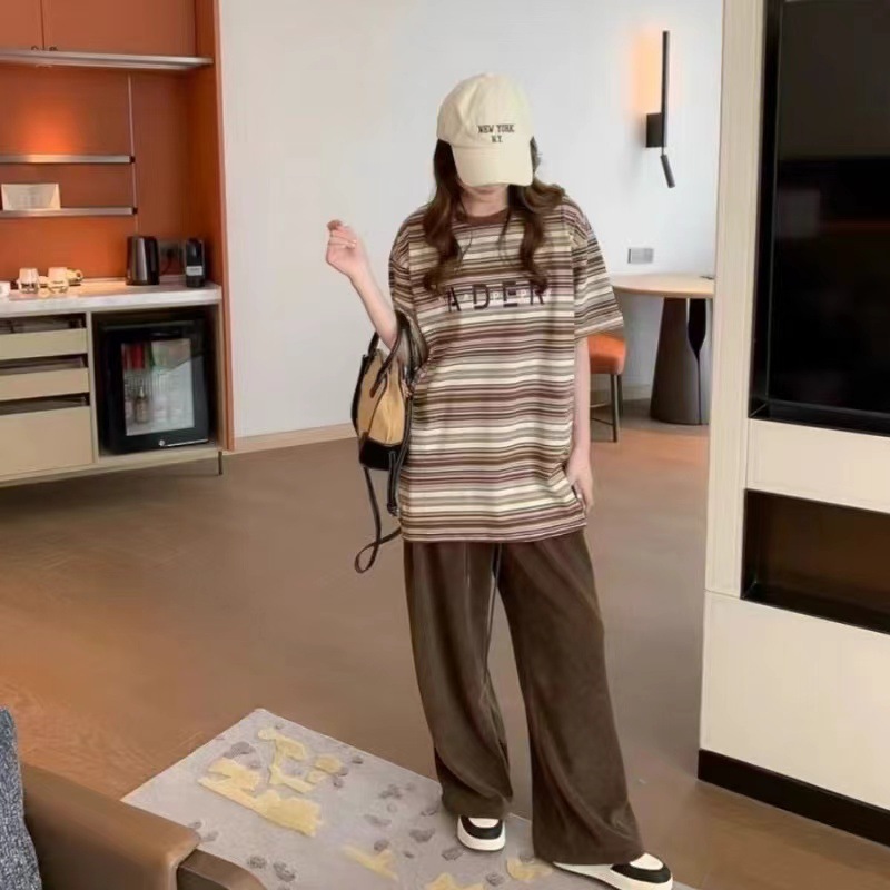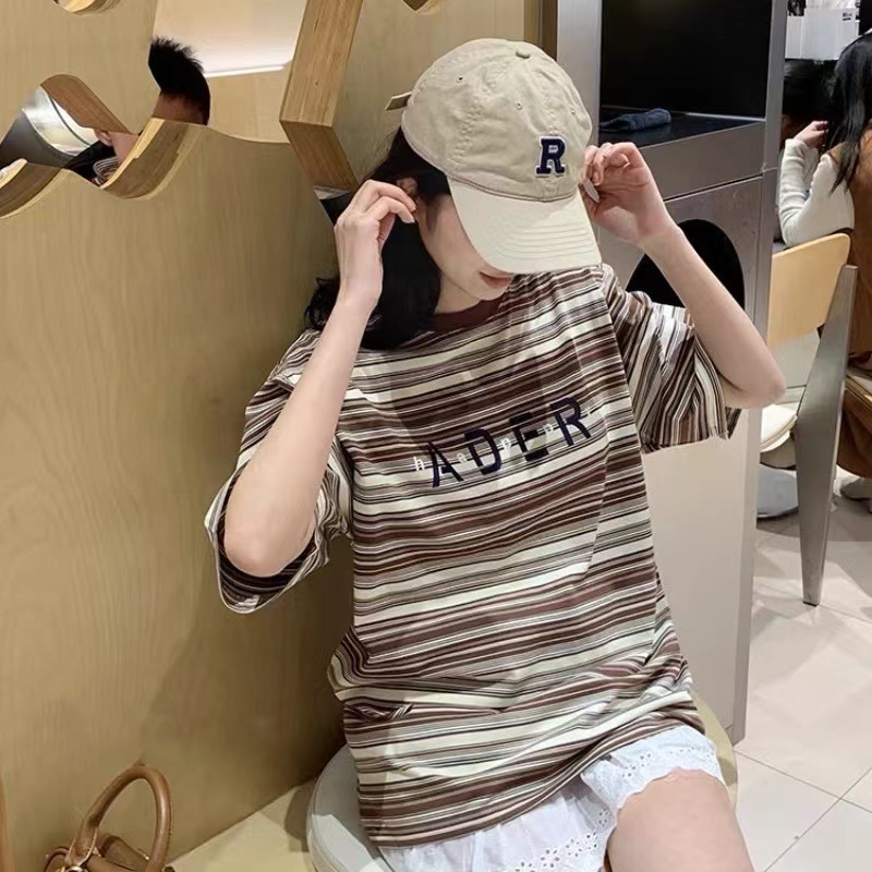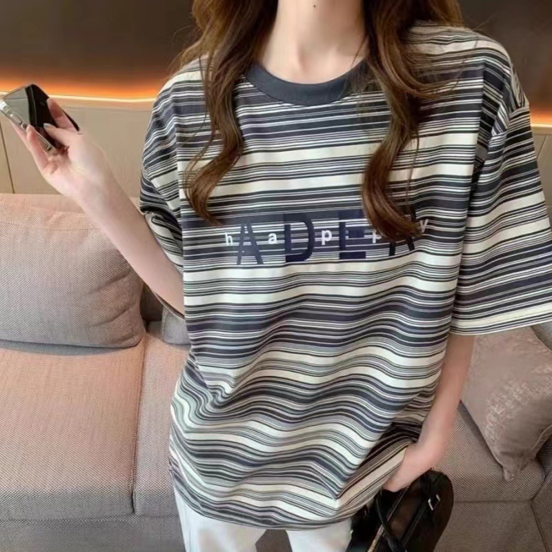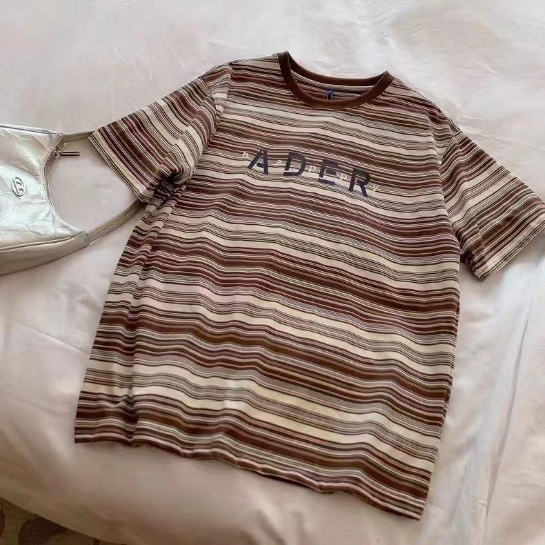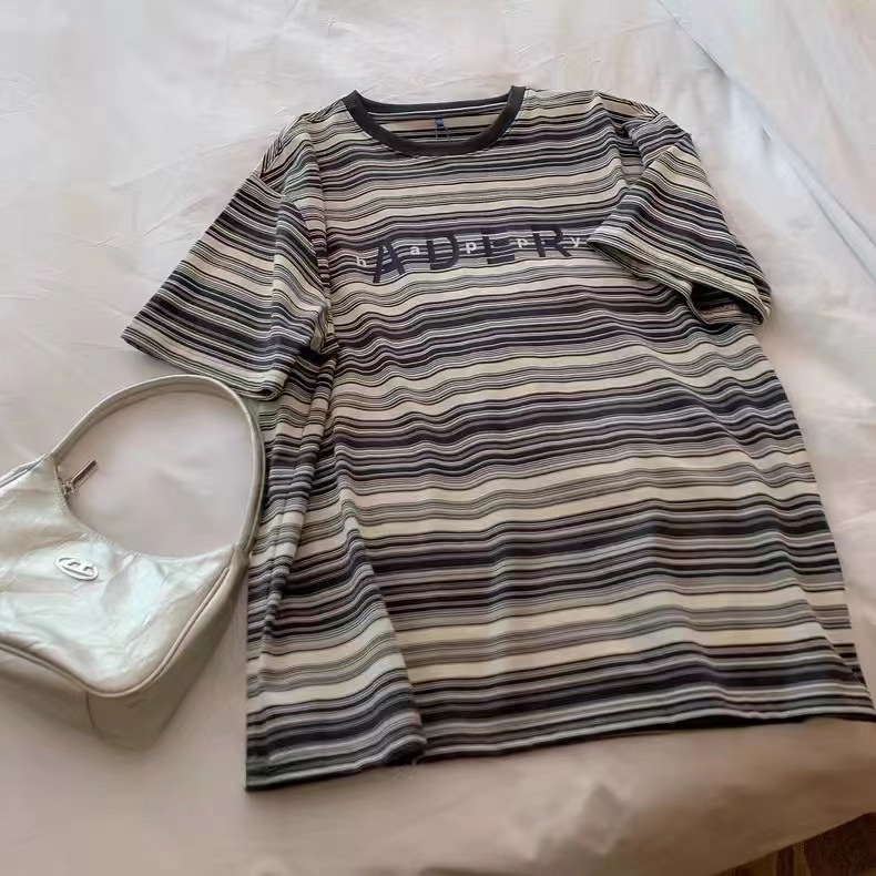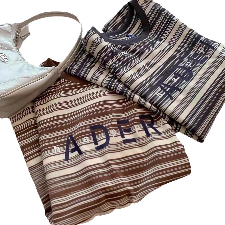 春夏季新款条纹短袖男女 情侣款宽松休闲字母印花情侣t恤