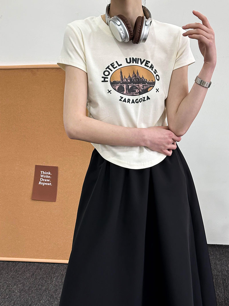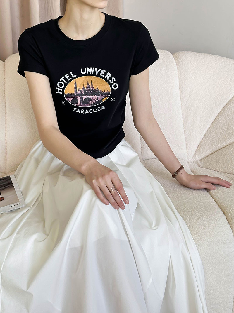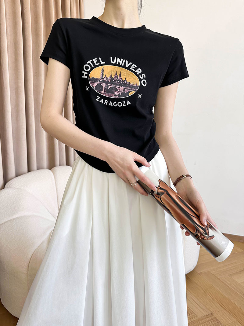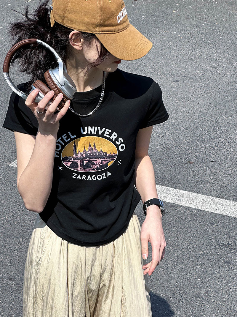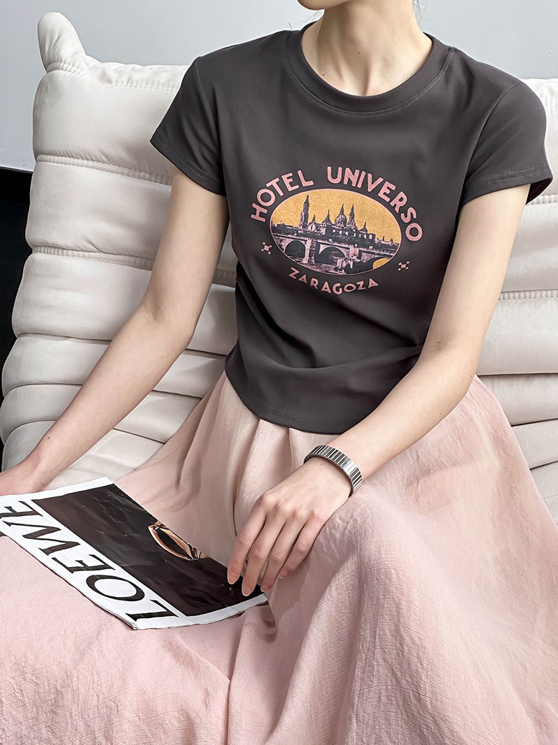 夏季新款T恤上衣女韩系圆领收腰复古小众印花短袖