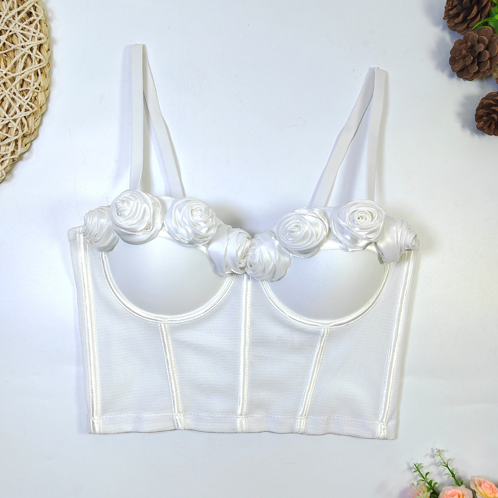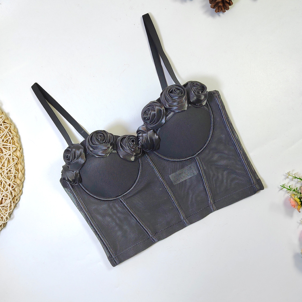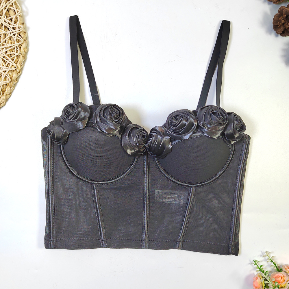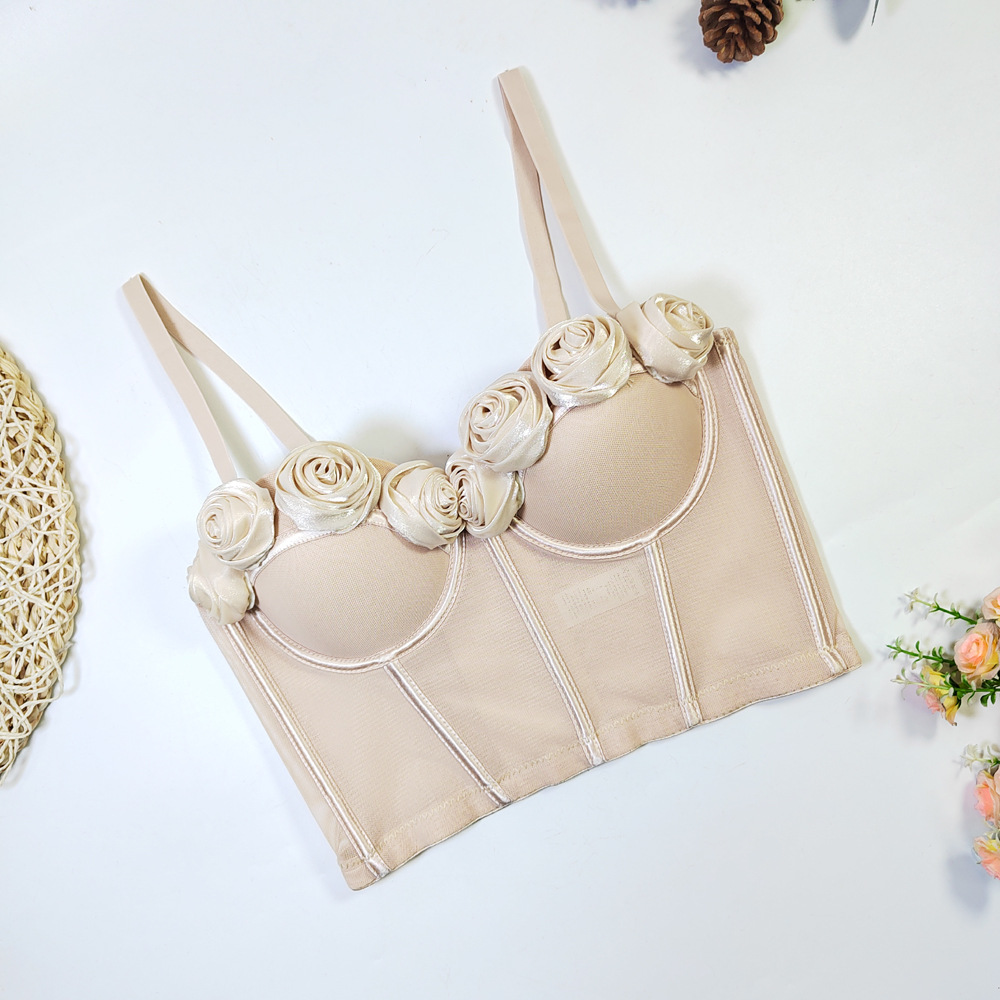 法式设计感手工玫瑰花朵抹胸外穿网纱美背内衣一体固定杯鱼骨吊带