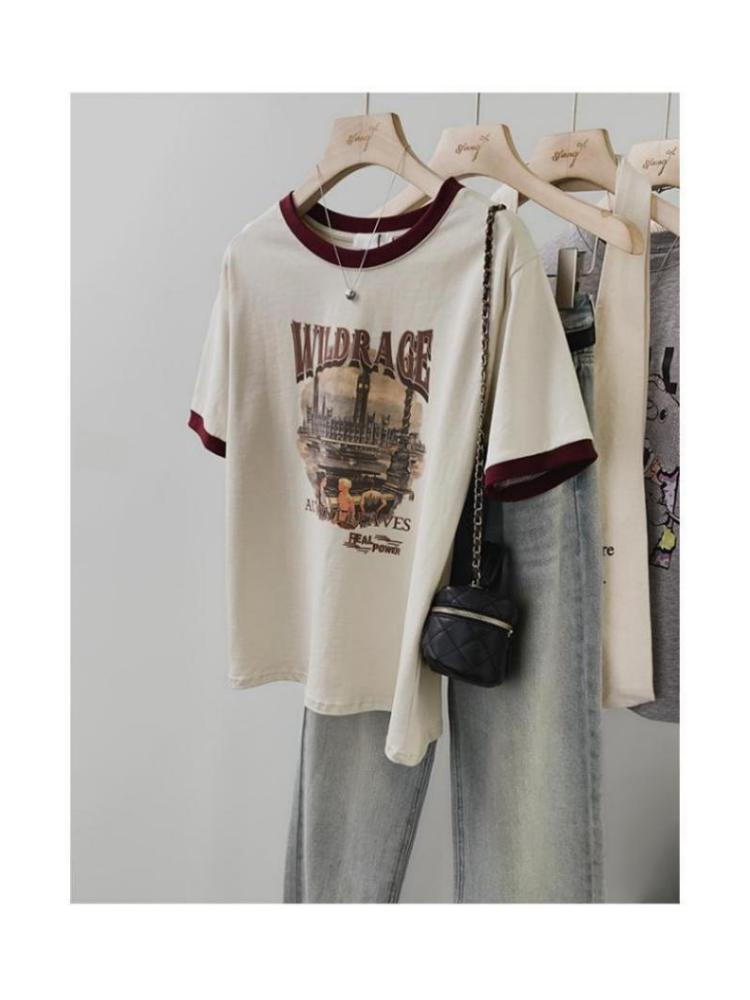 纯棉正肩短袖t恤女夏季新款设计感小众美式复古宽松上衣体恤