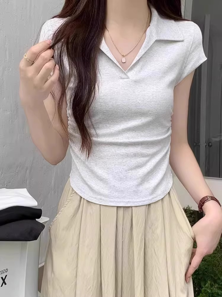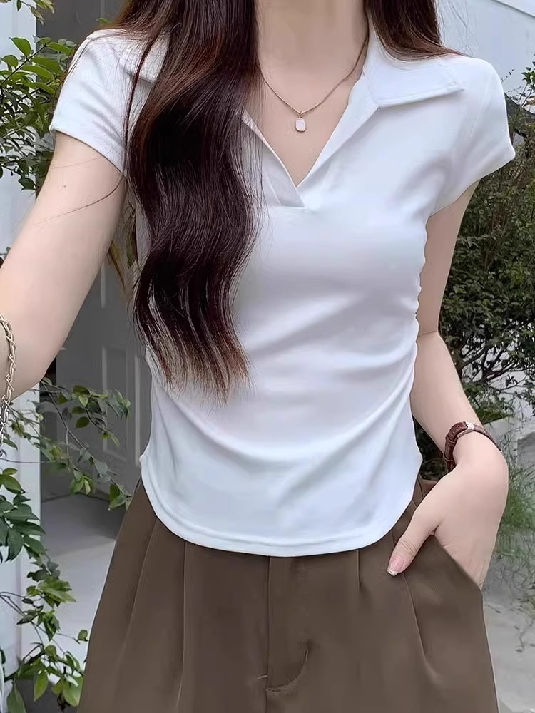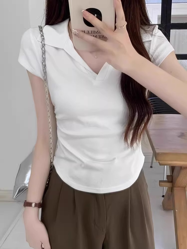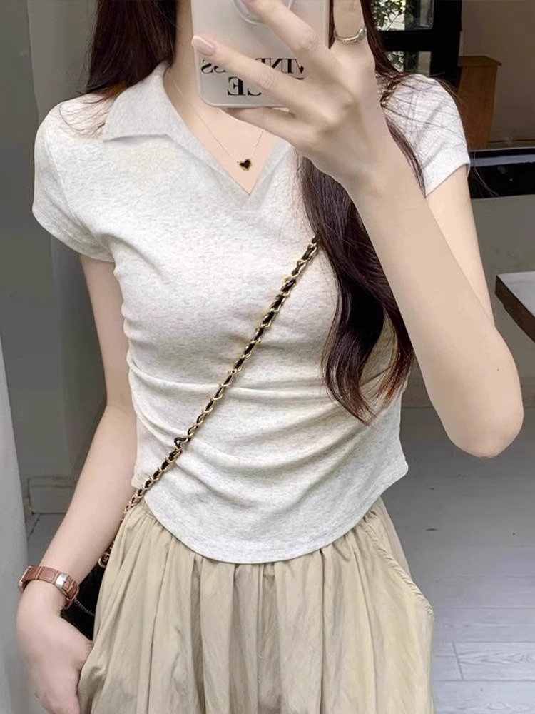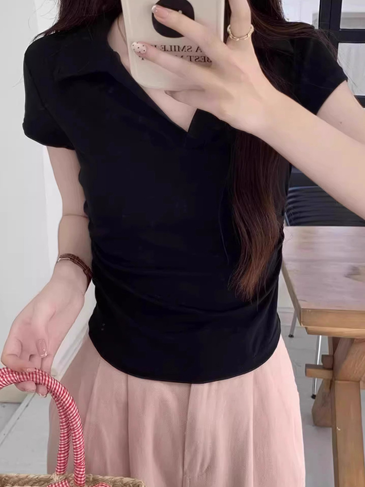 正肩短袖T恤女夏季美式辣妹polo翻领设计感纯欲收腰短款V领上衣桖