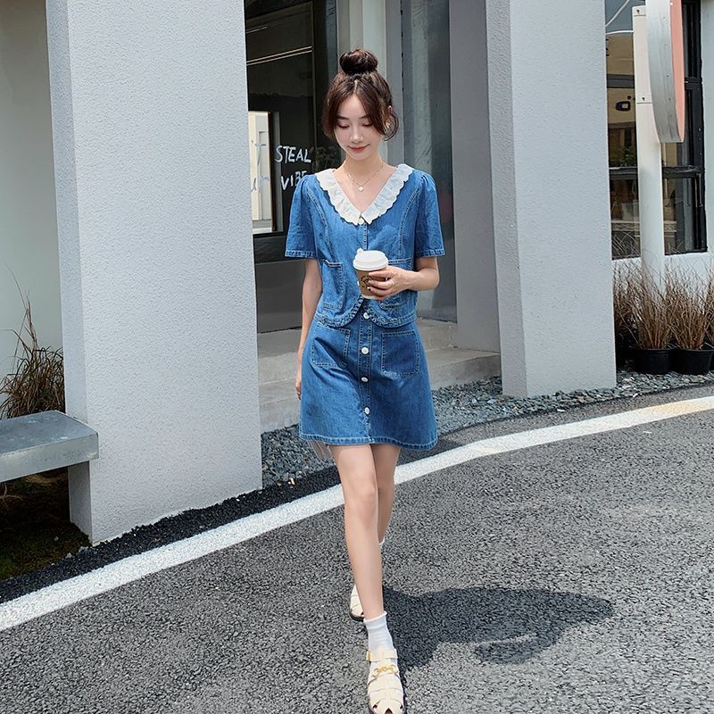 蓝色牛仔套装裙女夏款薄款韩版甜美短袖上衣A字半身裙两件套